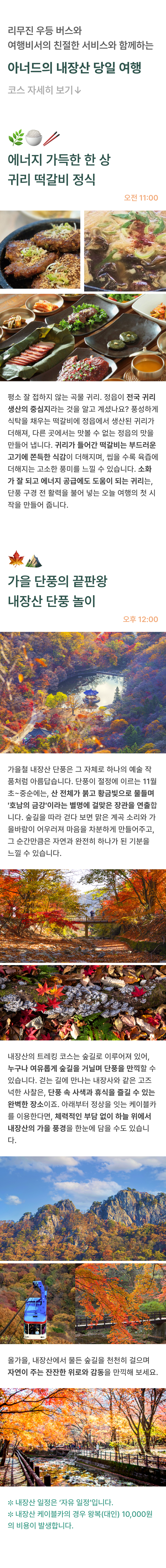 • 포함 사항 🚌 28인승 리무진 우등버스 1인1좌석 (✽실제 배차 차량은 아너드 그린 차량이 아닐 수도 있습니다.) 💁 여행비서/기사 경비 🥪 조식 샌드위치 🍚 중식 식사 : 귀리 떡갈비 정식 • 불포함 사항 📑 여행자 보험, 기타 개인 경비 |