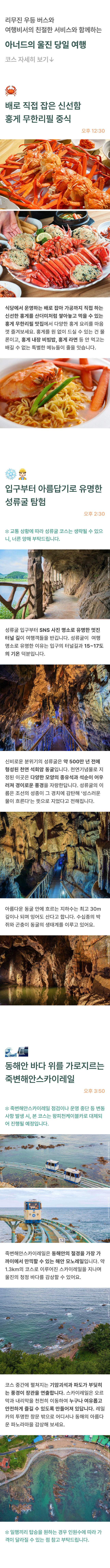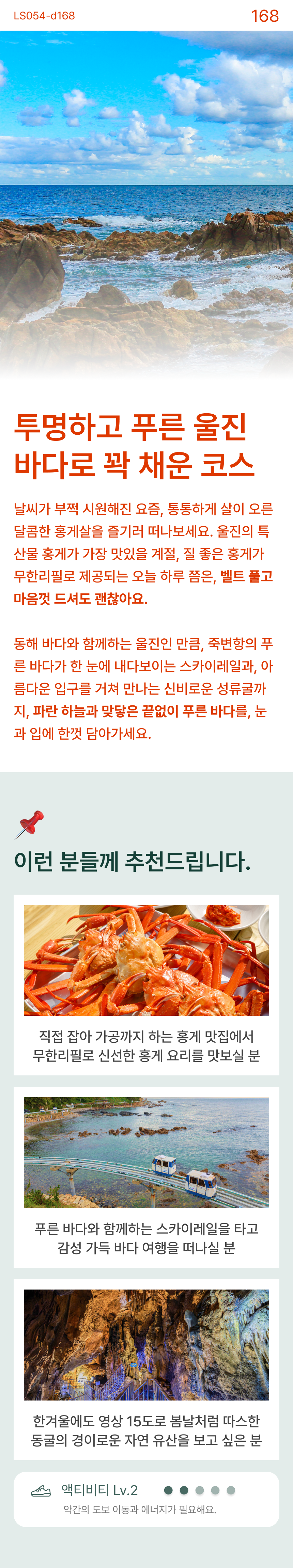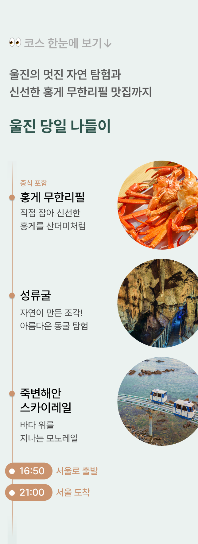 푸른 바다의 고장 울진의 맛과 색, 오늘 하루 실컷 담아가세요. •20인 이상 출발 • 포함 사항 🚌 28인승 리무진 우등버스 1인1좌석 (✽실제 배차 차량은 아너드 그린 차량이 아닐 수도 있습니다.) 💁 여행비서/기사 경비 🥪 조식 샌드위치 🦀 중식: 홍게무한리필 🚄 죽변스카이레일 이용권 (✽특정 식재료에 알레르기가 있는 경우, 상세페이지 하단의 원료를 참고해주세요.) • 불포함 사항 📑 여행자 보험, 기타 개인 경비 🎟️ 성류굴 입장료 5,000원