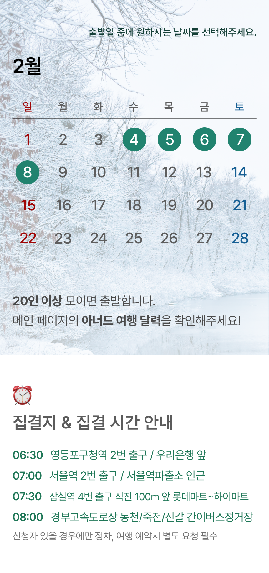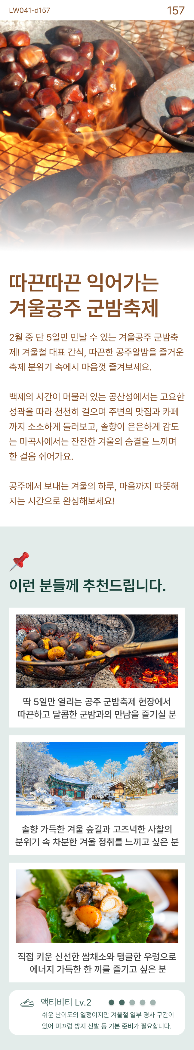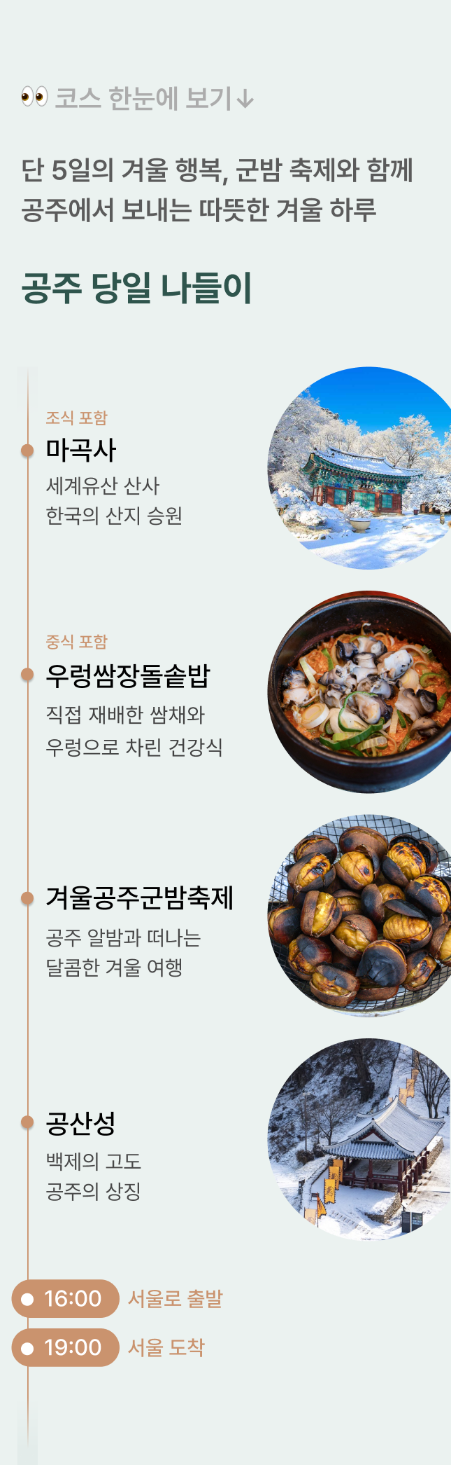 공주 알밤과 떠나는 달콤한 겨울 여행 #겨울공주군밤축제 #공산성 #마곡사 #우렁쌈장돌솥밥 • 1~2월 출발 한정 2026 아너드 달력 판매 (✽달력 옵션 추가 시 여행 당일 여행비서가 전달드릴 예정입니다.) • 포함 사항 🚌 28인승 리무진 우등버스 1인1좌석 (✽실제 배차 차량은 아너드 그린 차량이 아닐 수도 있습니다.) 💁 여행비서/기사 경비 🥪 조식 샌드위치 (✽특정 식재료에 알레르기가 있는 경우, 상세페이지 하단의 원료를 참고해주세요.) 🍚 중식 우렁쌈장돌솥밥 (✽본 상품페이지에 안내된 식사 메뉴는 버스 1대(27명) 한정으로 제공되며, 이후 증차 시에는 새롭게 준비된 동급의 메뉴로 대체 제공됩니다. ) • 불포함 사항 📑 여행자 보험, 기타 개인 경비 🎟️ 축제장 내 발생 비용, 공산성 입장료 |
