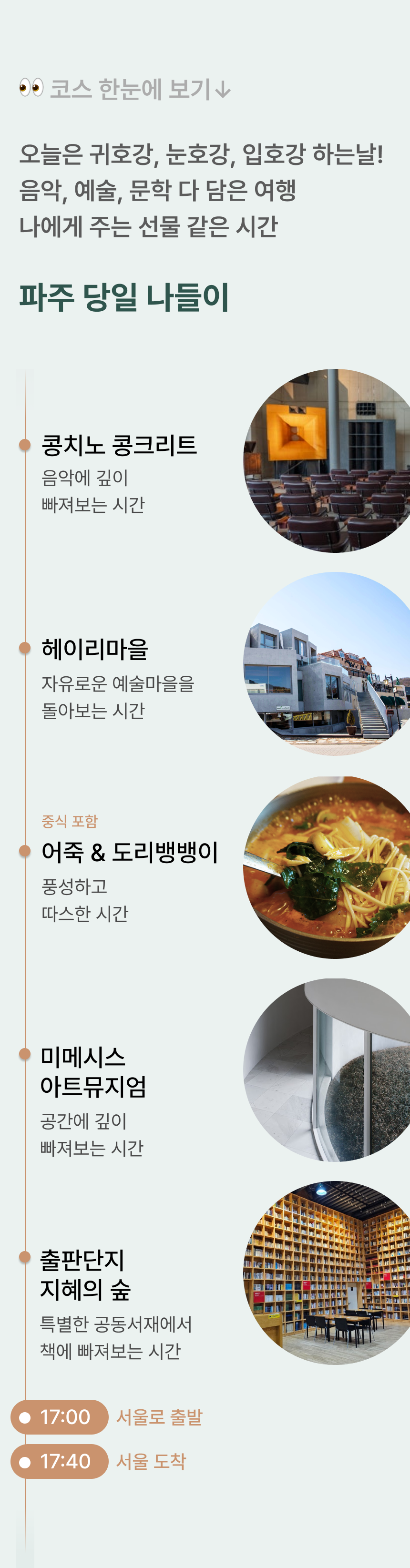 겨울에는 따뜻한 실내에서! 예술의 도시 파주에서 음악/독서/전시를 담아봐요! #콩치노 콩크리트 #헤이리마을 #미메시스 아트뮤지엄 #지혜의숲 • 포함 사항 💁 여행비서/기사 경비 🥪 조식 샌드위치 🍽️ 중식 : 어죽&도리뱅뱅이 🎟️ 콩치노 콩크리트 이용료(30,000원) 🎟️ 미메시스 아트뮤지엄 입장료(10,000원) 🎟️ 지혜의 숲 입장료 (✽특정 식재료에 알레르기가 있는 경우, 상세페이지 하단의 원료를 참고해주세요.) • 불포함 사항 📑 여행자 보험, 기타 개인 경비 |