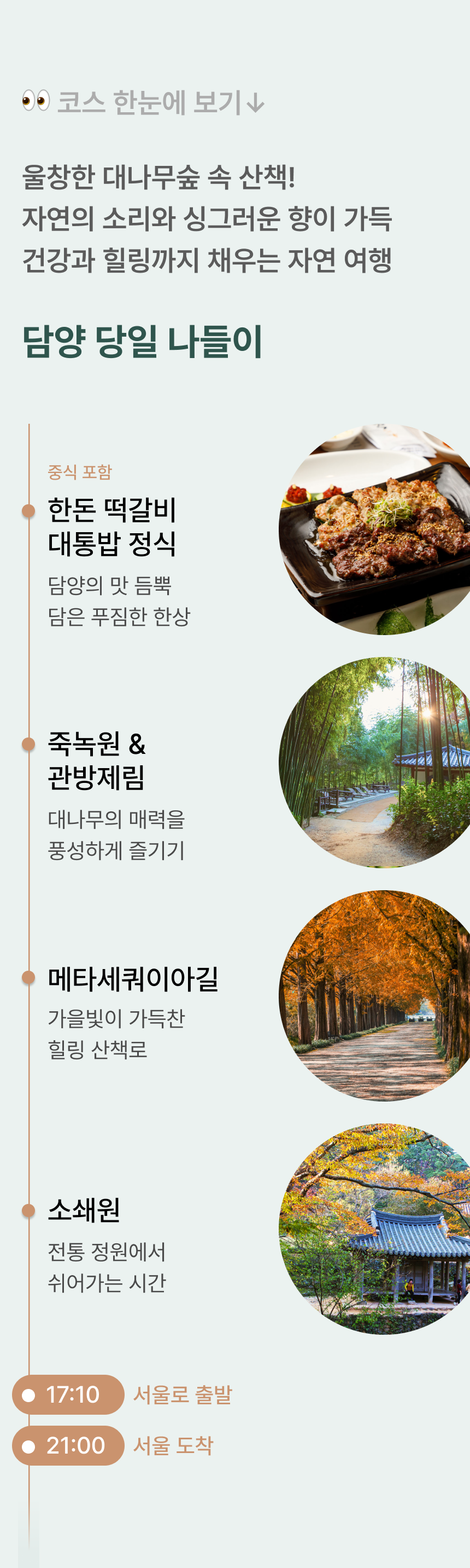 선선한 바람부는 대나무 숲 거닐고, 가을빛 메타세쿼이어길에서 제대로 힐링해요! #죽녹원&관방제림 #소쇄원 #메타세쿼이어길 #떡갈비 대통밥정식 • 20인 이상 출발 • 포함 사항 🚌 28인승 리무진 우등버스 1인1좌석 (✽실제 배차 차량은 아너드 그린 차량이 아닐 수도 있습니다.) 💁 여행비서/기사 경비 🍚 중식 : 한돈 떡갈비 대통밥정식 28000원 🎟️ 죽녹원 입장료 🎟️ 소쇄원 입장료 (✽특정 식재료에 알레르기가 있는 경우, 상세페이지 하단의 원료를 참고해주세요.) • 불포함 사항 📑 여행자 보험, 기타 개인 경비 |