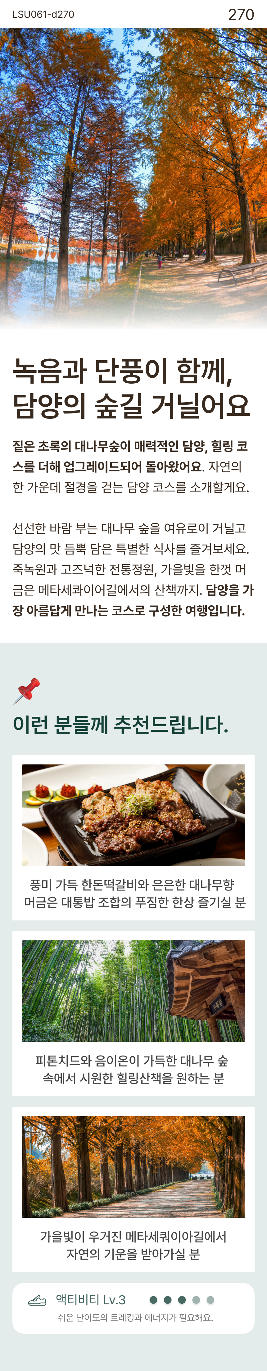 선선한 바람부는 대나무 숲 거닐고, 가을빛 메타세쿼이어길에서 제대로 힐링해요!