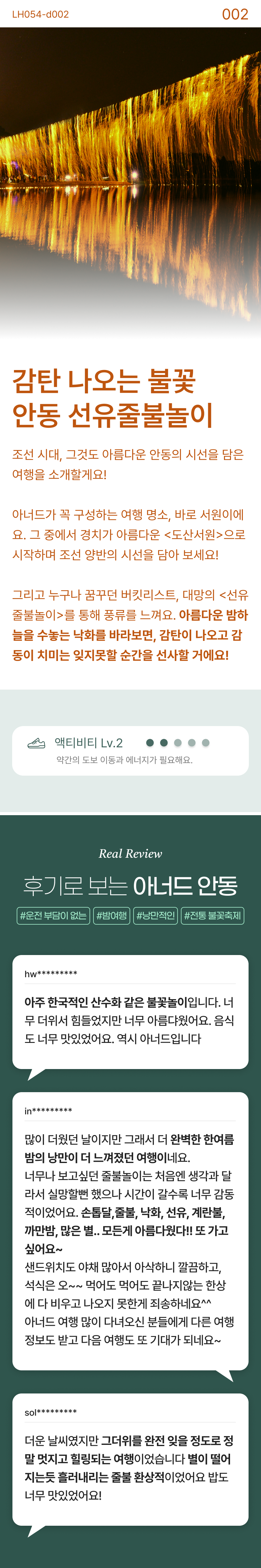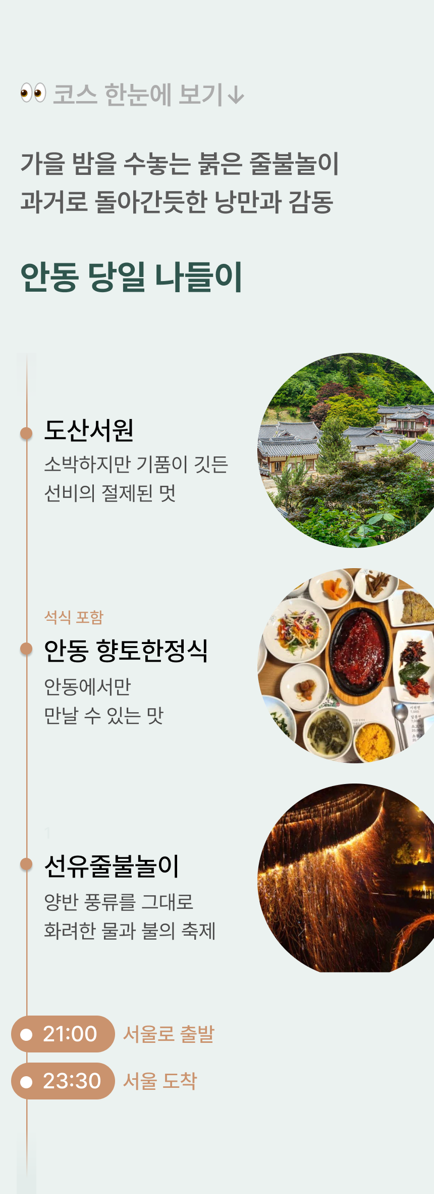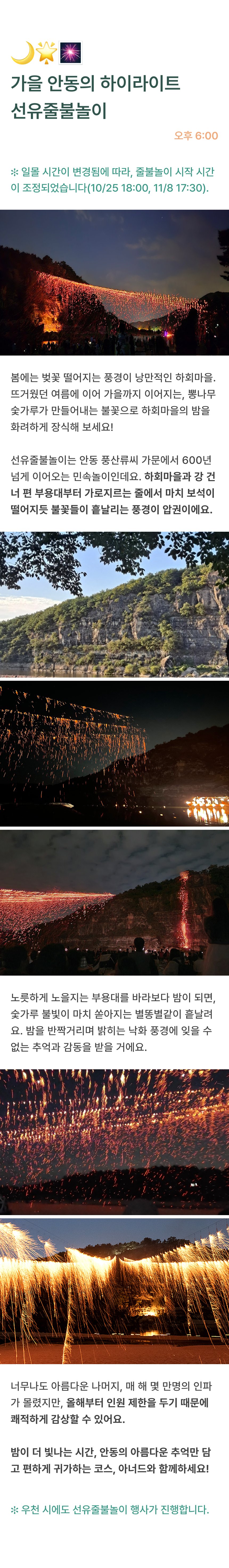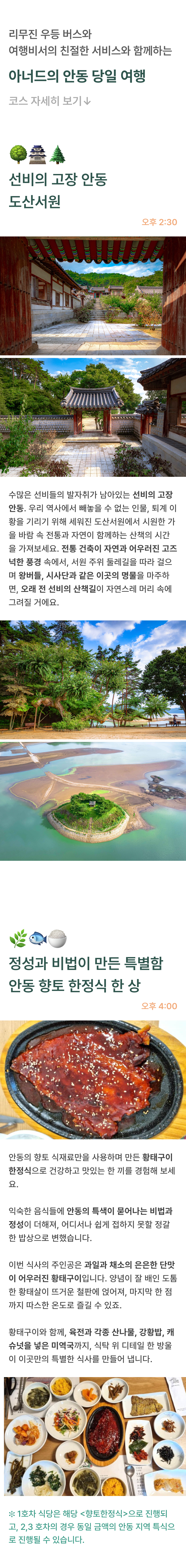 누구나 꿈꾸던 버킷리스트! <선유줄불놀이>를 통해 안동의 풍류를 즐겨보아요. • 포함 사항 🚌 28인승 리무진 우등버스 1인1좌석 (✽실제 배차 차량은 아너드 그린 차량이 아닐 수도 있습니다.) 💁 여행비서/기사 경비 🥪 중식 샌드위치(조식과 동일한 제품) 🍚 석식 : 안동 향토한정식 🎟️ 선유줄불놀이 입장료 • 불포함 사항 📑 여행자 보험, 기타 개인 경비 |