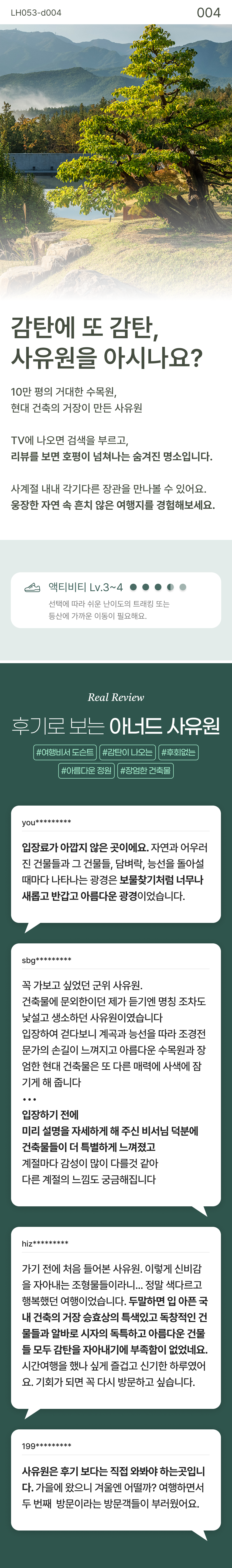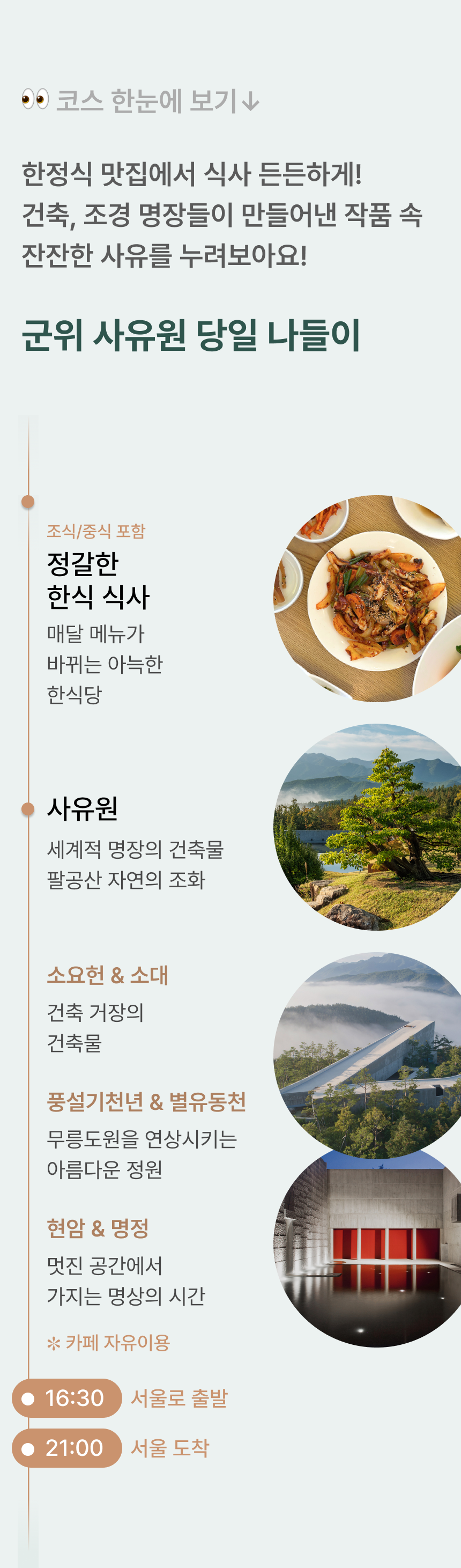 #예술문화 테마 BEST 여행-사유원 • 포함 사항 🚌 28인승 리무진 우등버스 1인1좌석 (✽실제 배차 차량은 아너드 그린 차량이 아닐 수도 있습니다.) 💁 여행비서/기사 경비 🍙 조식 샌드위치 🎫 입장료 (주말 69,000/평일 50,000) 🍚 점심 식사 : 정갈한 더덕비빔밥 (✽특정 식재료에 알레르기가 있는 경우, 상세페이지 하단의 원료를 참고해주세요.) • 불포함 사항 📑 여행자 보험, 기타 개인 경비 |