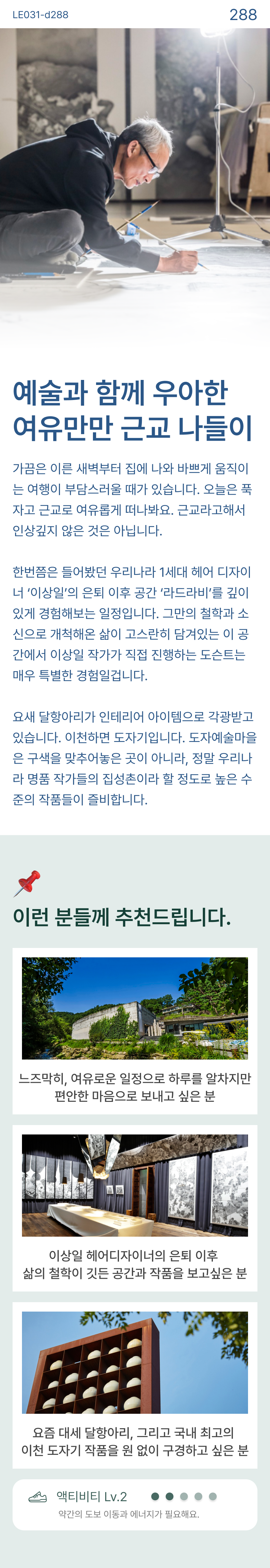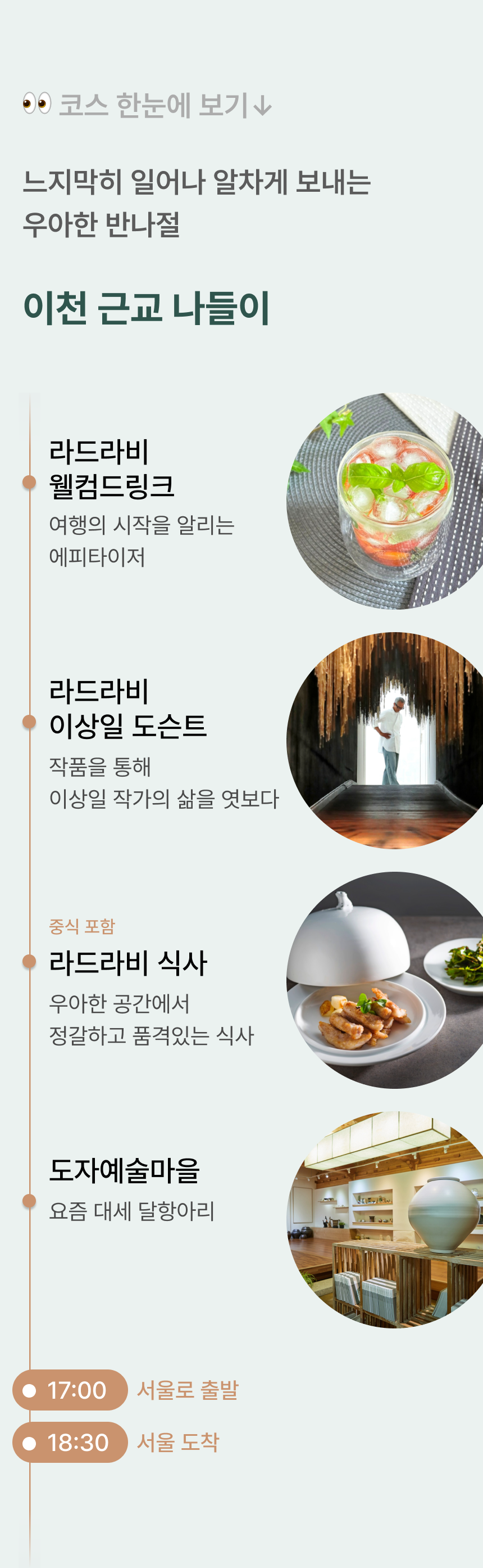 아너드 피플, 인물이 주는 이야기와 감동 #2 이상일 디자이너의 스토리텔링 #라드라비 #토시살or박대구이 정식 #예스파크 6일은 예스파크 일정이 다른 일정으로 변경될 수 있습니다. • 20인 이상 출발• 포함 사항 🚌 28인승 리무진 우등버스 1인1좌석 (✽실제 배차 차량은 아너드 그린 차량이 아닐 수도 있습니다.) 💁 여행비서/기사 경비 🥪 조식 샌드위치 🍚 중식 : 토시살 or 박대구이 정식 중 택1 🎟️ 토마토 바질에이드(웰컴드링크) 및 라드라비 관람권 포함 (✽특정 식재료에 알레르기가 있는 경우, 상세페이지 하단의 원료를 참고해주세요.) • 불포함 사항 📑 여행자 보험, 기타 개인 경비