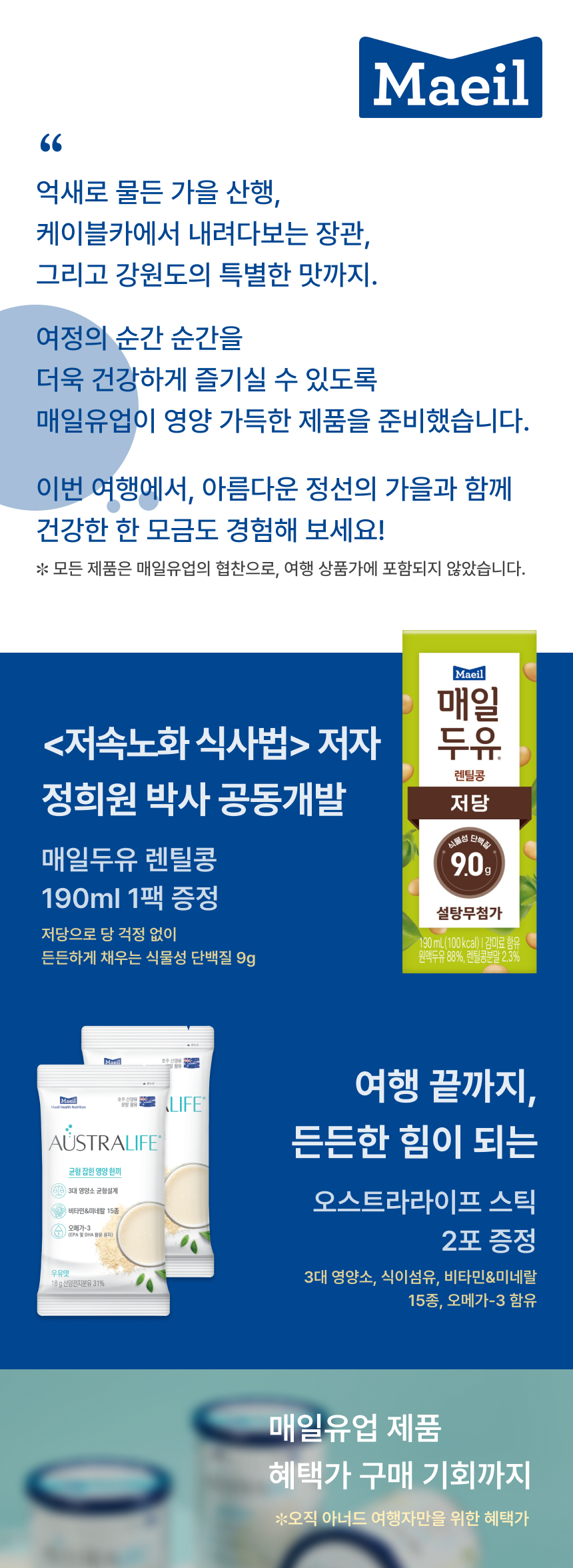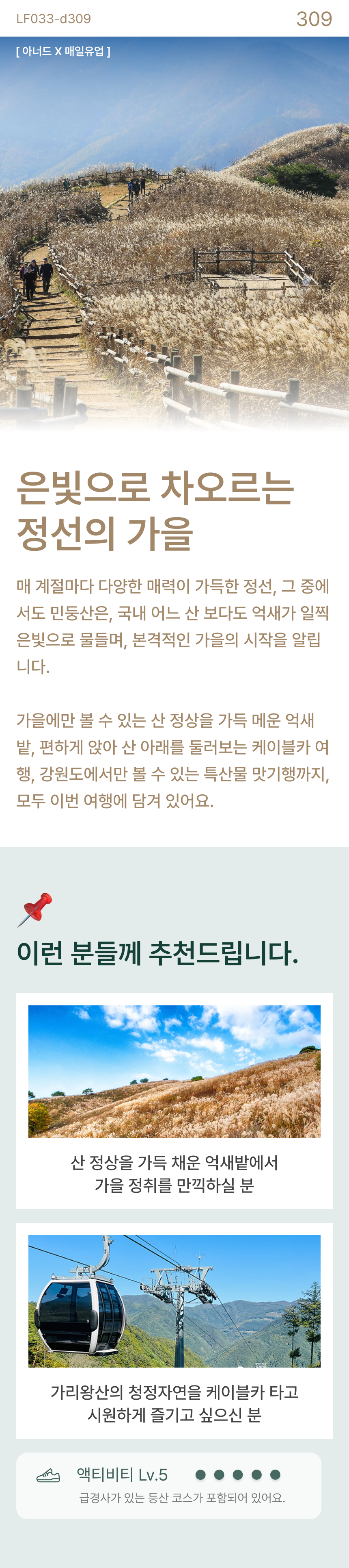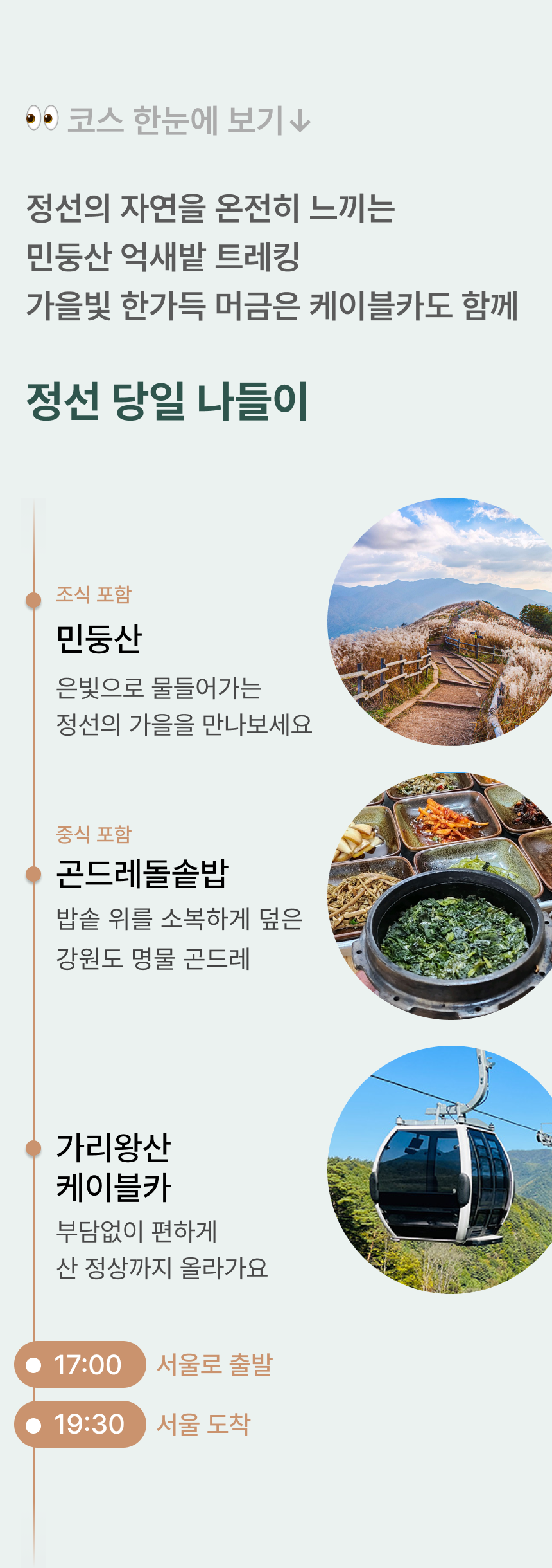 산 정상을 가득히 채운 은빛 억새밭, 민둥산에서 가장 먼저 만나보세요 #민둥산억새 #가리왕산 케이블카 #곤드레돌솥밥 • 20인 이상 출발 • 포함 사항 🚌 28인승 리무진 우등버스 1인1좌석 (✽실제 배차 차량은 아너드 그린 차량이 아닐 수도 있습니다.) 💁 여행비서/기사 경비 🥪 조식 샌드위치 🍚 중식: 곤드레돌솥밥 🚠 가리왕산 케이블카 이용료 (✽특정 식재료에 알레르기가 있는 경우, 상세페이지 하단의 원료를 참고해주세요.) • 불포함 사항 📑 여행자 보험, 기타 개인 경비 |