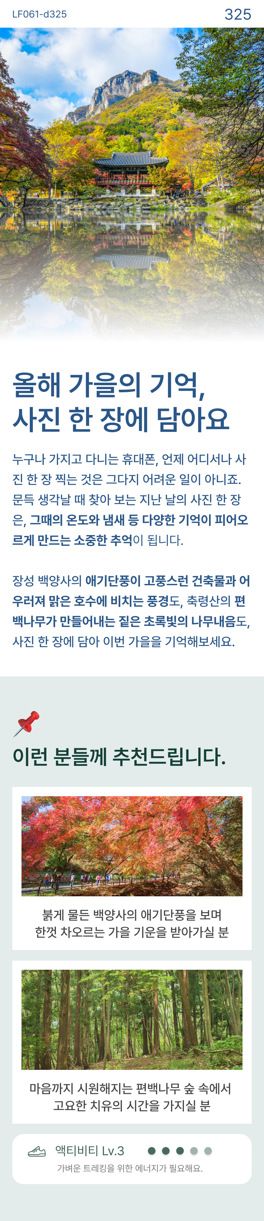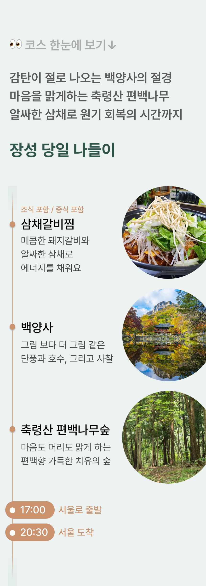 붉게 물든 애기단풍 가득한 아름다운 사찰과, 시원한 편백향의 치유의 숲을 거닐어요 #백양사애기단풍 #축령산편백숲 #삼채갈비찜 • 포함 사항 🚌 28인승 리무진 우등버스 1인1좌석 (✽실제 배차 차량은 아너드 그린 차량이 아닐 수도 있습니다.) 💁 여행비서/기사 경비 🥪 조식 샌드위치 🍚 중식 삼채갈비찜 (✽특정 식재료에 알레르기가 있는 경우, 상세페이지 하단의 원료를 참고해주세요.) • 불포함 사항 📑 여행자 보험, 기타 개인 경비 |