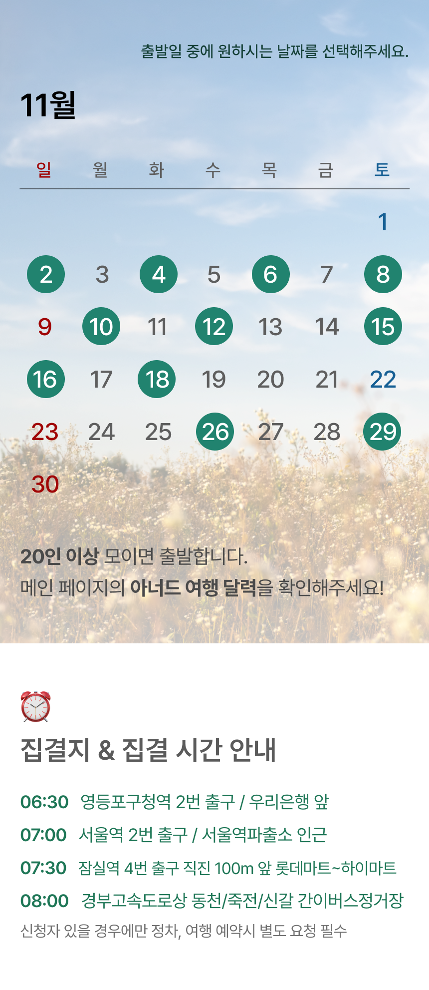 붉게 물드는 내변산 깊숙히, 부안의 새로운 매력을 발견해 보아요 #직소폭포단풍 #내소사전나무숲 #채석강 #인삼바지락죽 • 포함 사항 🚌 28인승 리무진 우등버스 1인1좌석 (✽실제 배차 차량은 아너드 그린 차량이 아닐 수도 있습니다.) 💁 여행비서/기사 경비 🥪 조식 샌드위치 🍚 중식 인삼바지락죽&바지락메밀전 (✽특정 식재료에 알레르기가 있는 경우, 상세페이지 하단의 원료를 참고해주세요.) • 불포함 사항 📑 여행자 보험, 기타 개인 경비 |