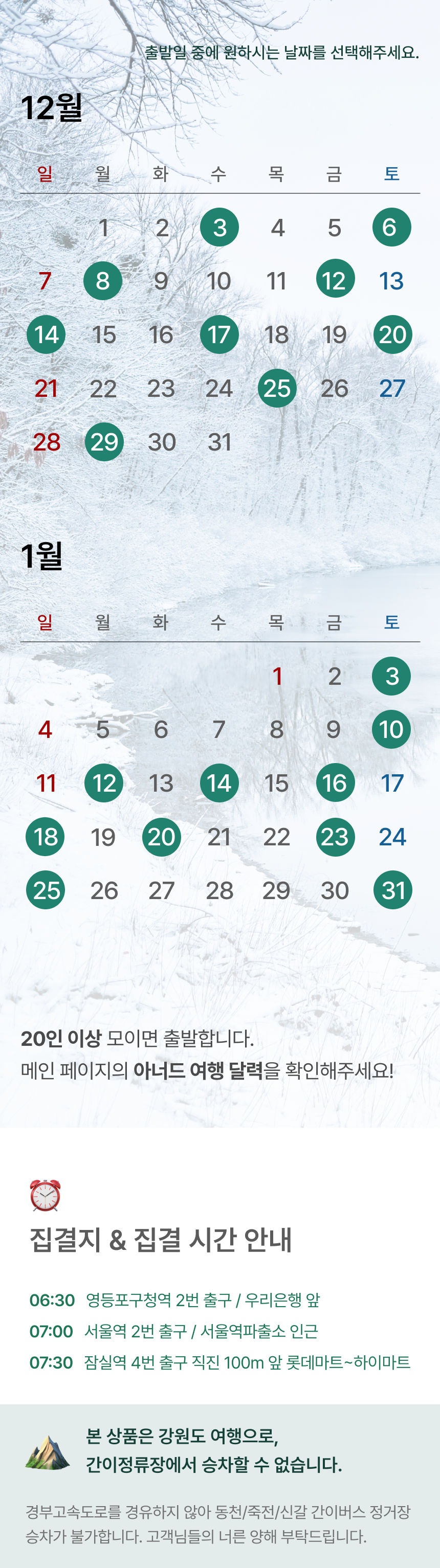 하늘과 가장 가까운 이곳 대관령, 눈으로 가득한 하얀 풍경을 거닐어요. #실버벨교회 #국민의숲 #양떼목장 #황태구이정식 • 포함 사항 🚌 28인승 리무진 우등버스 1인1좌석 (✽실제 배차 차량은 아너드 그린 차량이 아닐 수도 있습니다.) 💁 여행비서/기사 경비 🥪 조식 샌드위치 🍚 중식 황태구이 정식 🎟️ 양떼목장 입장료 (✽특정 식재료에 알레르기가 있는 경우, 상세페이지 하단의 원료를 참고해주세요.) • 불포함 사항 📑 여행자 보험, 기타 개인 경비 |