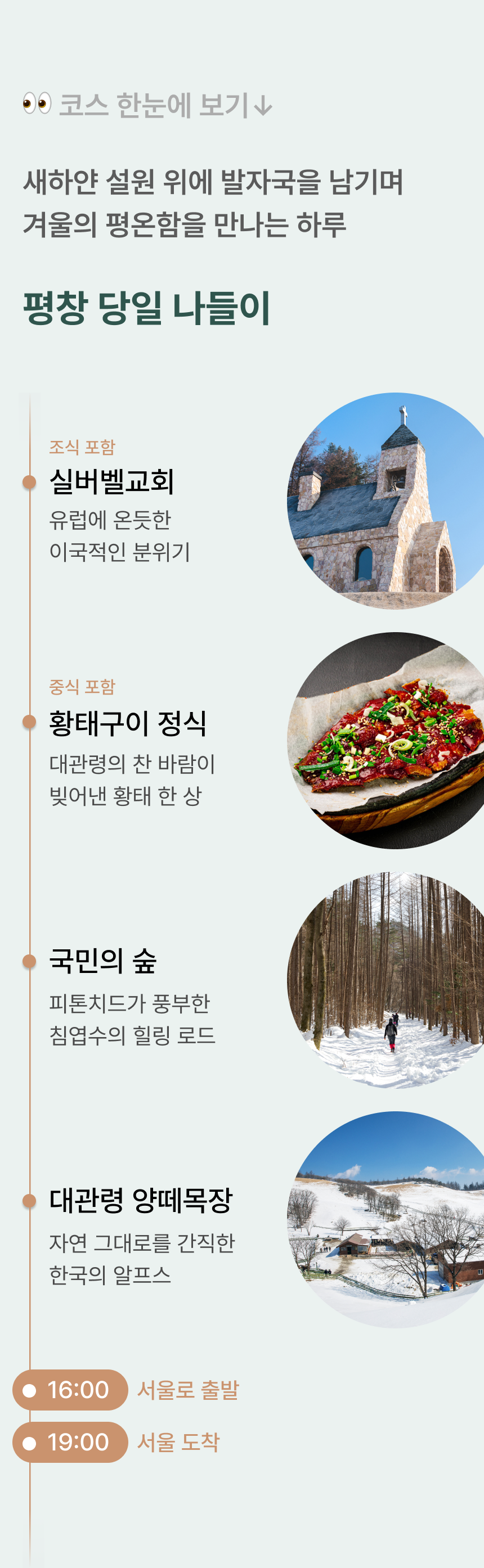 하늘과 가장 가까운 이곳 대관령, 눈으로 가득한 하얀 풍경을 거닐어요. #실버벨교회 #국민의숲 #양떼목장 #황태구이정식 • 포함 사항 🚌 28인승 리무진 우등버스 1인1좌석 (✽실제 배차 차량은 아너드 그린 차량이 아닐 수도 있습니다.) 💁 여행비서/기사 경비 🥪 조식 샌드위치 🍚 중식 황태구이 정식 🎟️ 양떼목장 입장료 (✽특정 식재료에 알레르기가 있는 경우, 상세페이지 하단의 원료를 참고해주세요.) • 불포함 사항 📑 여행자 보험, 기타 개인 경비 |