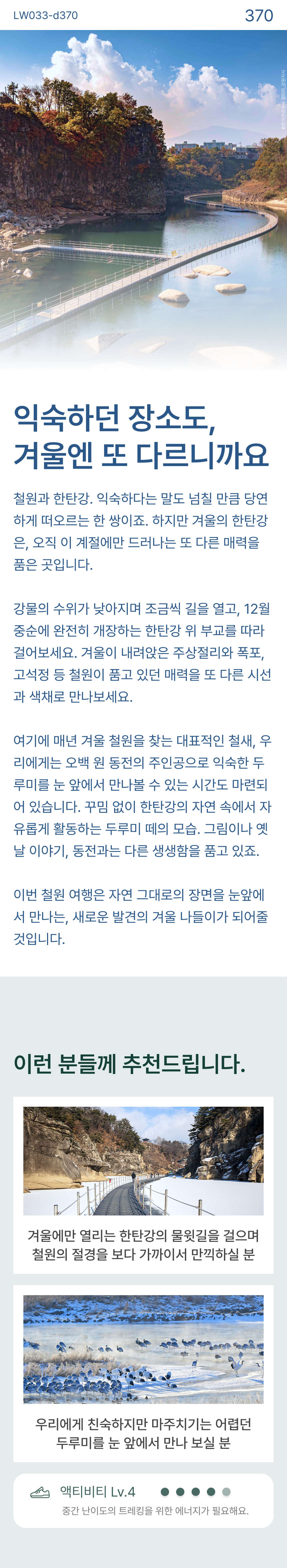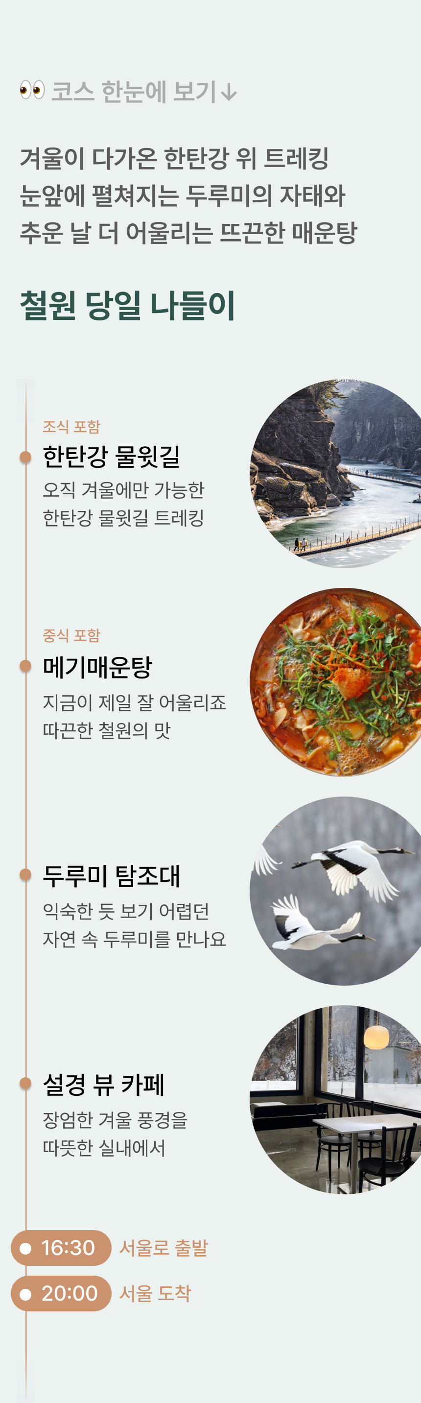 익숙하게 느껴지던 한탄강, 이번 겨울 새로운 매력을 만나보세요. #물윗길트레킹 #두루미탐조 #메기매운탕 • 포함 사항 🚌 28인승 리무진 우등버스 1인1좌석 (✽실제 배차 차량은 아너드 그린 차량이 아닐 수도 있습니다.) 💁 여행비서/기사 경비 🥪 조식 샌드위치 🍚 중식 메기매운탕 (✽특정 식재료에 알레르기가 있는 경우, 상세페이지 하단의 원료를 참고해주세요.) • 불포함 사항 📑 여행자 보험, 기타 개인 경비 🎟️ 철원 물윗길 입장료(10,000원, 철원사랑상품권 5,000원 환급) 🎟️ 이길리 두루미 탐조대 입장료(15,000원, 철원사랑상품권 10,000원 환급) |