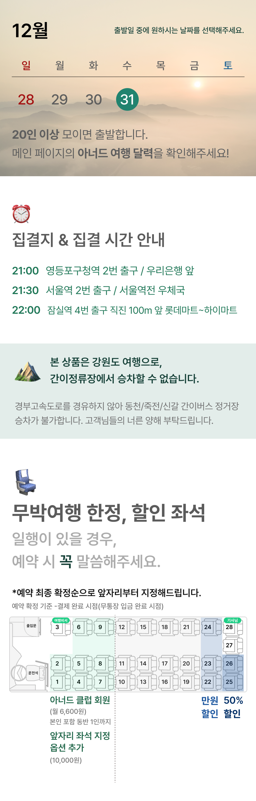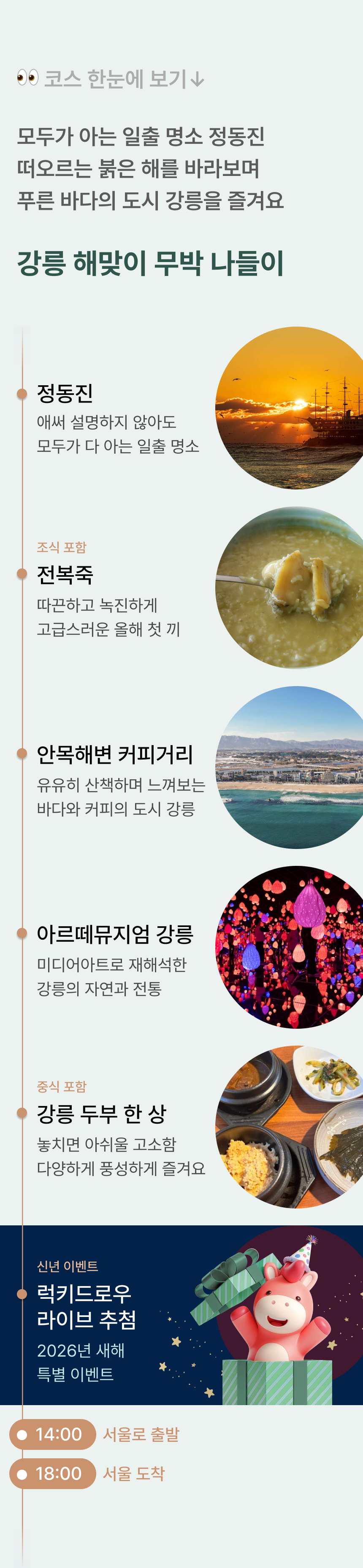 #강릉 정동진 해맞이 #아르떼뮤지엄 #안목해변 #전복죽 #초당두부 한상 🎁 해맞이 여행 참여자 전원 럭키드로우 선물 증정 •20인 이상 출발 • 포함 사항 🚌 28인승 리무진 우등버스 1인1좌석 (✽실제 배차 차량은 아너드 그린 차량이 아닐 수도 있습니다.) ✳좌석별 할인안내 확인바랍니다. 🚦기사님 2인 체제 💁 여행비서 🍚 조식 포함: 전복죽 20,000원 🍚 중식 포함: 초당두부 한상 20,000원 🎟️ 아르떼뮤지엄 강릉 입장권 17,000원 💚 핫팩, 간단 간식, 온열 안대, 일회용 슬리퍼, 칫솔&치약세트 • 불포함 사항 📑 여행자 보험, 기타 개인 경비 ☕ (선택) 안목해변 카페 음료