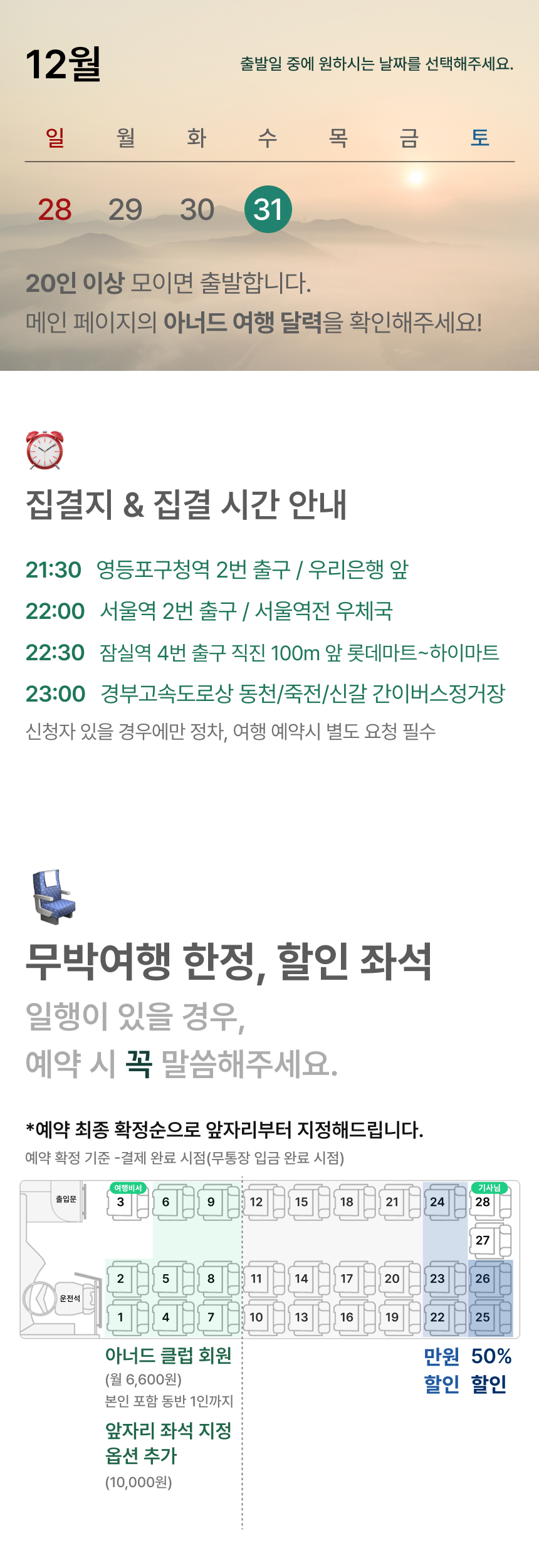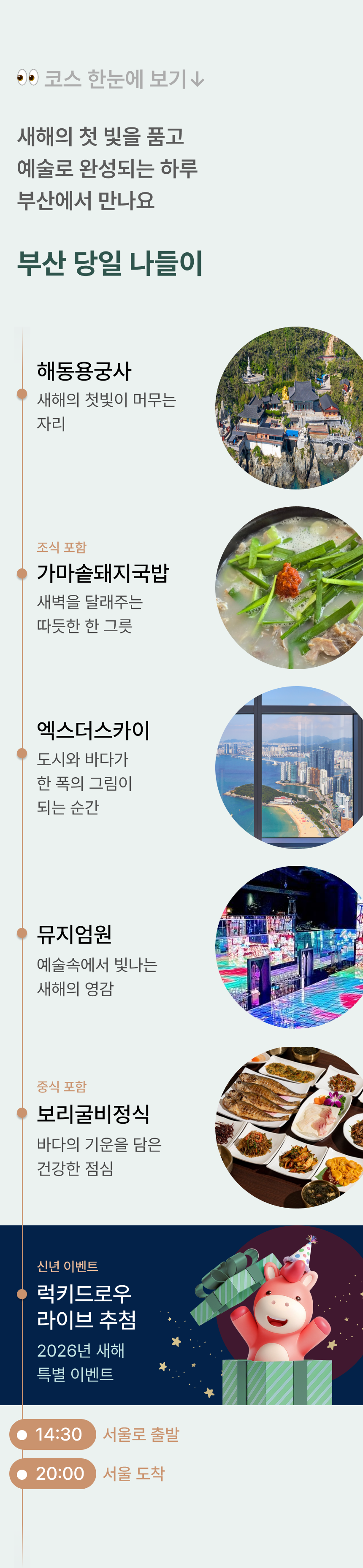 #부산 해동용궁사 해맞이 #엑스더스카이 #뮤지엄원 #돼지국밥 #보리굴비정식 🎁 해맞이 여행 참여자 전원 럭키드로우 선물 증정 •20인 이상 출발 • 포함 사항 🚌 28인승 리무진 우등버스 1인1좌석 (✽실제 배차 차량은 아너드 그린 차량이 아닐 수도 있습니다.) ✳좌석별 할인안내 확인바랍니다. 🚦기사님 2인 체제 💁 여행비서 🍚 조식 포함: 돼지국밥 🍚 중식 포함: 보리굴비정식 (28,000원) 💚 핫팩, 간단 간식, 온열 안대, 일회용 슬리퍼, 칫솔&치약세트 🏢엑스더스카이 입장료 (27,000원) 🎨뮤지엄 원 입장료 • 불포함 사항 📑 여행자 보험, 기타 개인 경비 ☕ (선택) 엑스더스카이 카페 음료 |