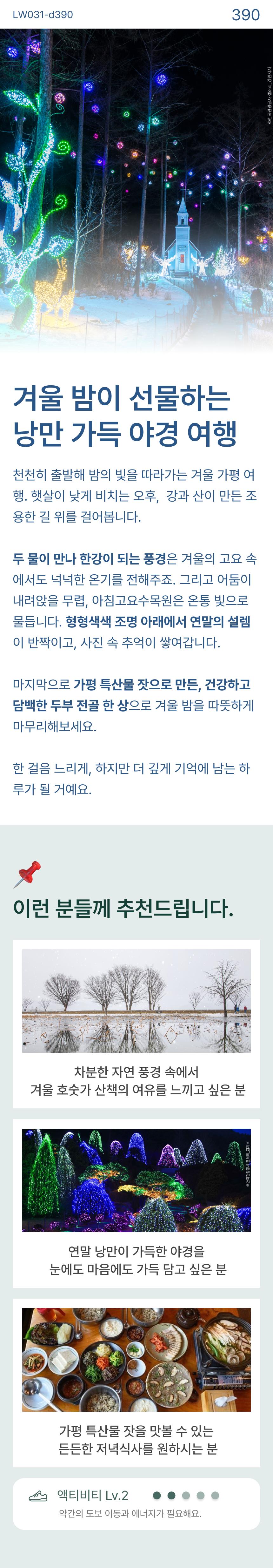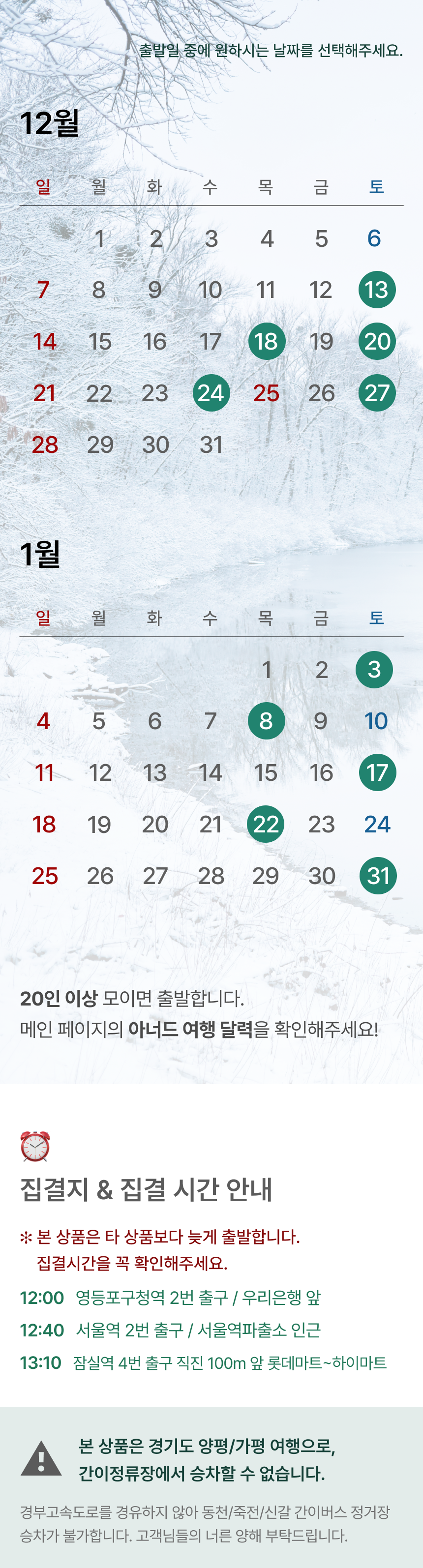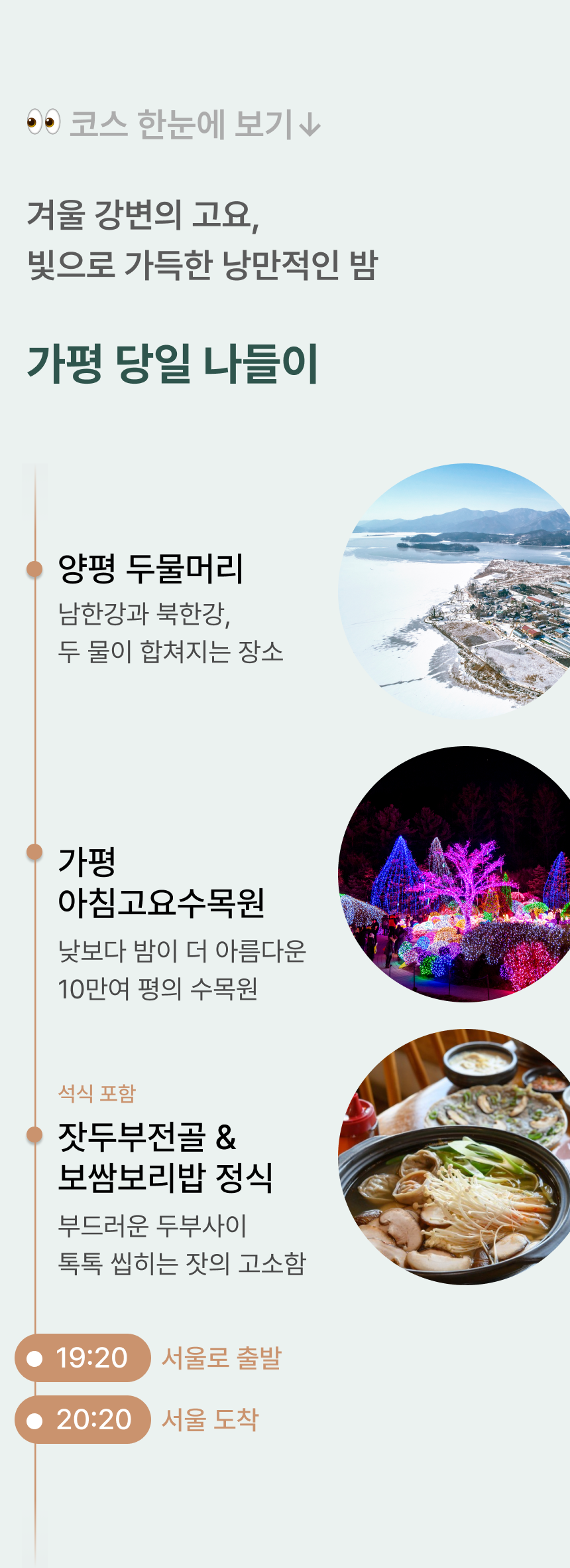 형형색색 조명 아래 연말의 설렘, 가평에서 따뜻하게 마무리하세요. #아침고요수목원 #오색불빛정원전 #두물머리 #잣두부전골 • 포함 사항 🚌 28인승 리무진 우등버스 1인1좌석 (✽실제 배차 차량은 아너드 그린 차량이 아닐 수도 있습니다.) 💁 여행비서/기사 경비 🍚 석식 잣두부전골&보쌈보리밥 정식(19,000원) 🎟️ 아침고요수목원 입장료(11,000원) (✽특정 식재료에 알레르기가 있는 경우, 상세페이지 하단의 원료를 참고해주세요.) • 불포함 사항 📑 여행자 보험, 기타 개인 경비 |