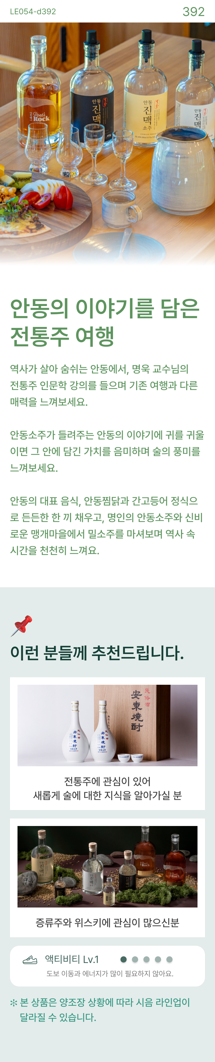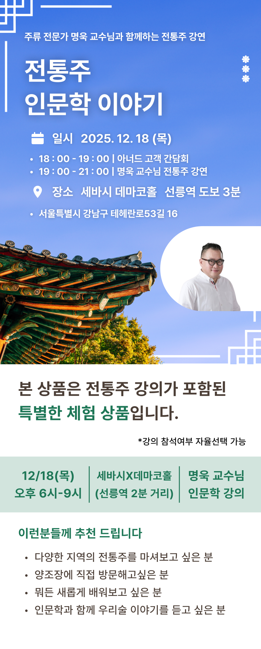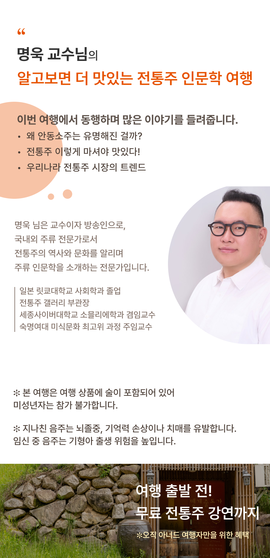 주류 전문가 명욱 교수님과 함께, 인문학이 담긴 아너드 첫 전통주 투어 떠나보세요. #명욱교수 #전통주 #인문학 #안동소주 #민속주안동소주 #전통주만들기체험 #진맥소주 #안동찜닭 #간고등어 ✽상품 구매 시 강의 참석 여부를 선택해주시기 바랍니다.(12.18(목) 오후 6-9시 예정) • 20인 이상 출발