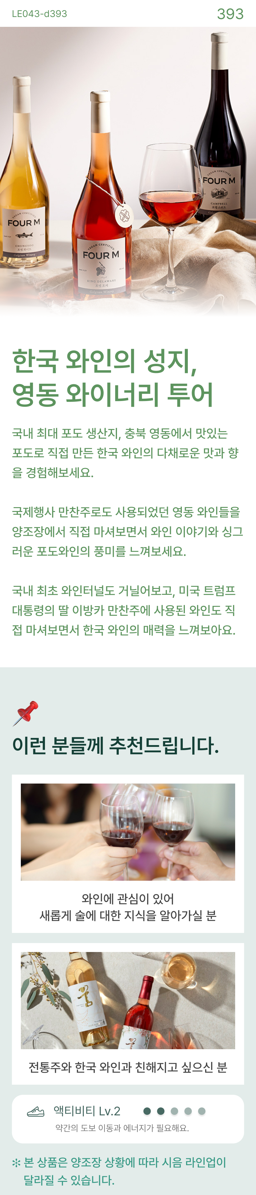 최상급 포도로 만든 국산 와인을 한국 와인의 성지, 영동에서 만나보세요! #영동와이너리투어 #갈기산포도농원 #영동와인터널 #영동와인공장 #여포의꿈 #항아리삼겹살 #와인페어링 ✽상품 구매 시 강의 참석 여부를 선택해주시기 바랍니다.(12.18(목) 오후 6-9시 예정)
