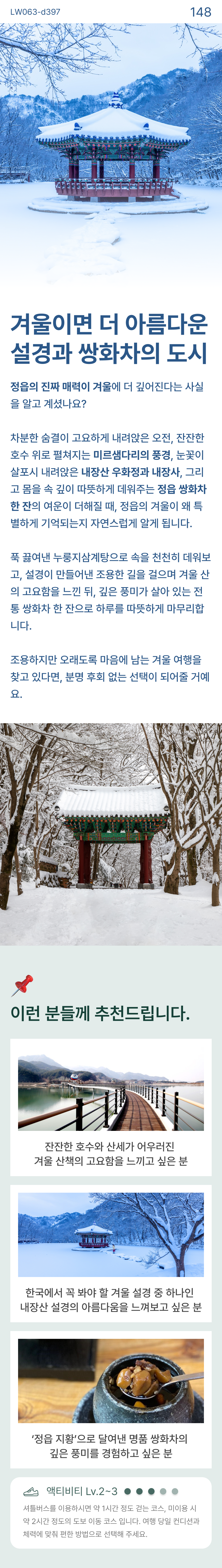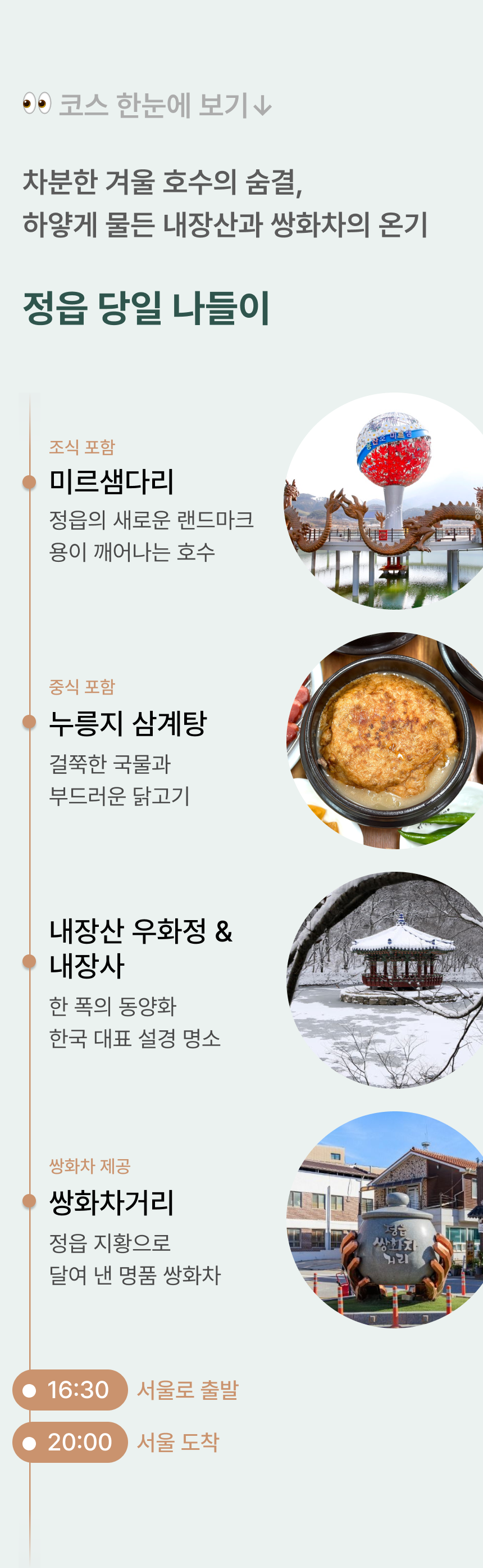 겨울이면 더 아름다운 쌍화차의 도시, 정읍의 계절은 아직 끝나지 않았어요. #내장산우화정 #설경 #미르샘다리 #쌍화차거리 #누룽지삼계탕 • 1~2월 출발 한정 2026 아너드 달력 판매 (✽달력 옵션 추가 시 여행 당일 여행비서가 전달드릴 예정입니다.) • 20인 이상 출발 • 포함 사항 🚌 28인승 리무진 우등버스 1인1좌석 (✽실제 배차 차량은 아너드 그린 차량이 아닐 수도 있습니다.) 💁 여행비서/기사 경비 🥪 조식 샌드위치 🍚 중식 누룽지 삼계탕 🫖 간식 쌍화차 (✽특정 식재료에 알레르기가 있는 경우, 상세페이지 하단의 원료를 참고해주세요.) • 불포함 사항 📑 여행자 보험, 기타 개인 경비 |