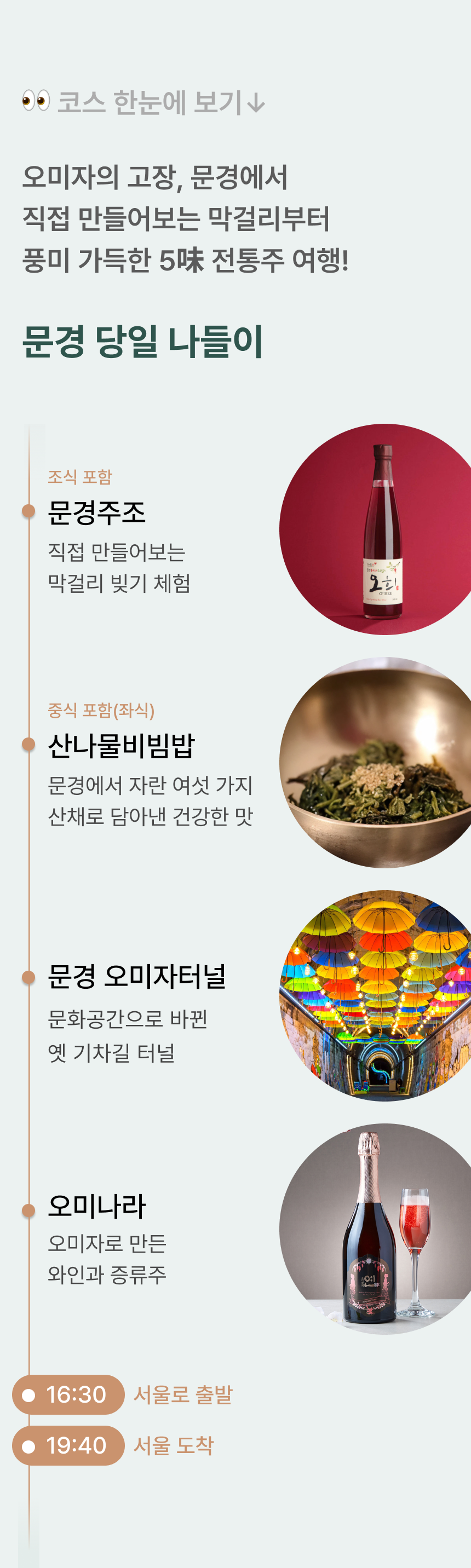 • 포함 사항 🚌 28인승 리무진 우등버스 1인1좌석 (✽실제 배차 차량은 아너드 그린 차량이 아닐 수도 있습니다.) 💁 여행비서/기사 경비 🥪 조식 샌드위치 🍶 문경주조 양조장 투어&막걸리 빚기 체험 (45,000원) 🍚 산나물비빔밥 정식 🎟️ 문경 오미자터널 입장료 🍶 오미나라 양조장 투어 (10,000원) (✽특정 식재료에 알레르기가 있는 경우, 상세페이지 하단의 원료를 참고해주세요.) • 불포함 사항 📑 여행자 보험, 기타 개인 경비 |