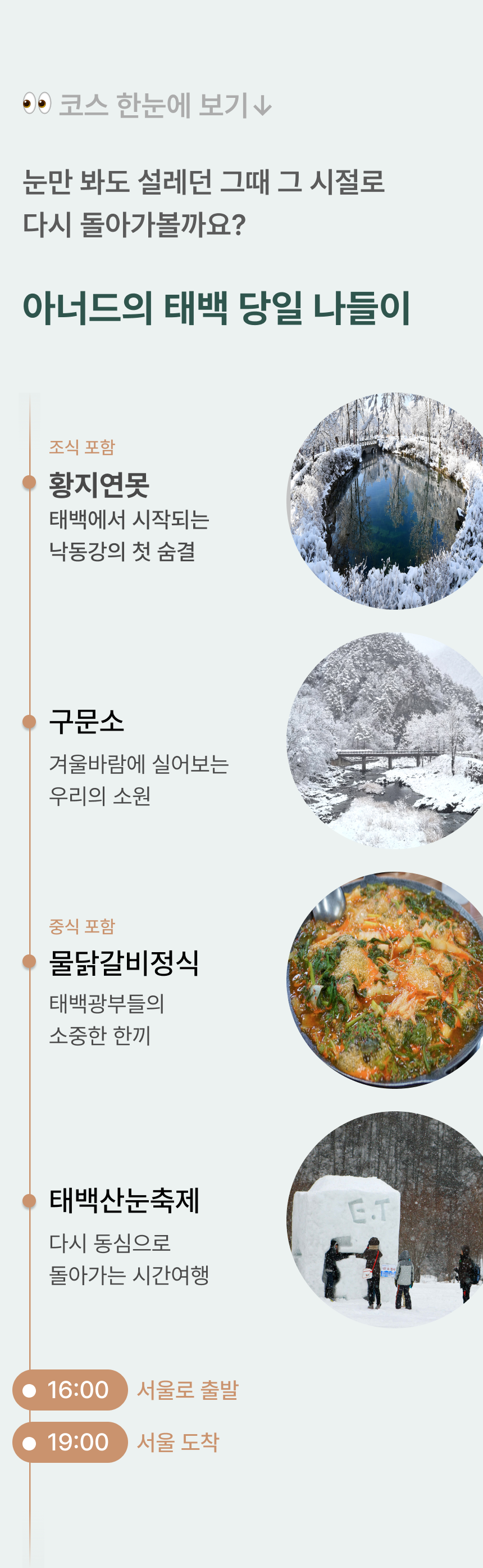 눈 덮힌 태백에서 잊고 있던 동심을 찾아보아요, #태백산눈축제 #구문소 #황지연못 #물닭갈비 • 1~2월 출발 한정 2026 아너드 달력 판매 (✽달력 옵션 추가 시 여행 당일 여행비서가 전달드릴 예정입니다.) • 20인 이상 출발 • 포함 사항 🚌 28인승 리무진 우등버스 1인1좌석 (✽ 실제 배차 차량은 아너드 그린 차량이 아닐 수도 있습니다.) 💁 여행비서/기사 경비 🥪 조식 샌드위치 🍚 중식 물닭갈비 (✽특정 식재료에 알레르기가 있는 경우, 상세페이지 하단의 원료를 참고해주세요.) • 불포함 사항 📑 여행자 보험, 기타 개인 경비 |