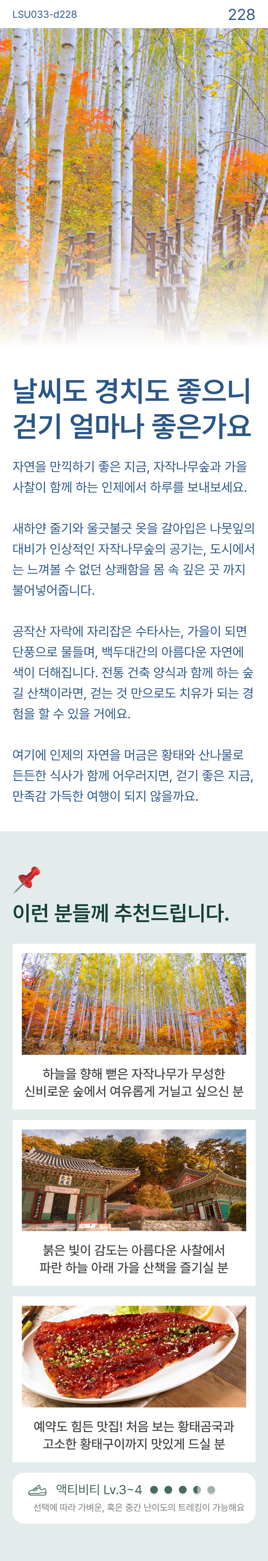 싱그러운 자작나무 숲 산책과 함께 가을빛을 머금은 수타사의 단풍을 즐겨보세요.