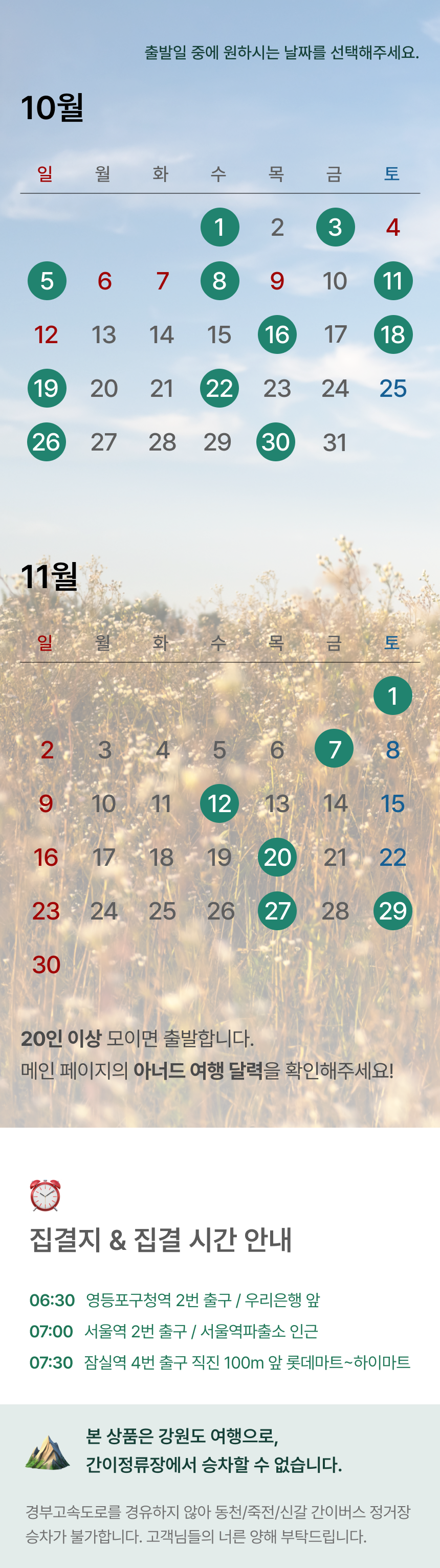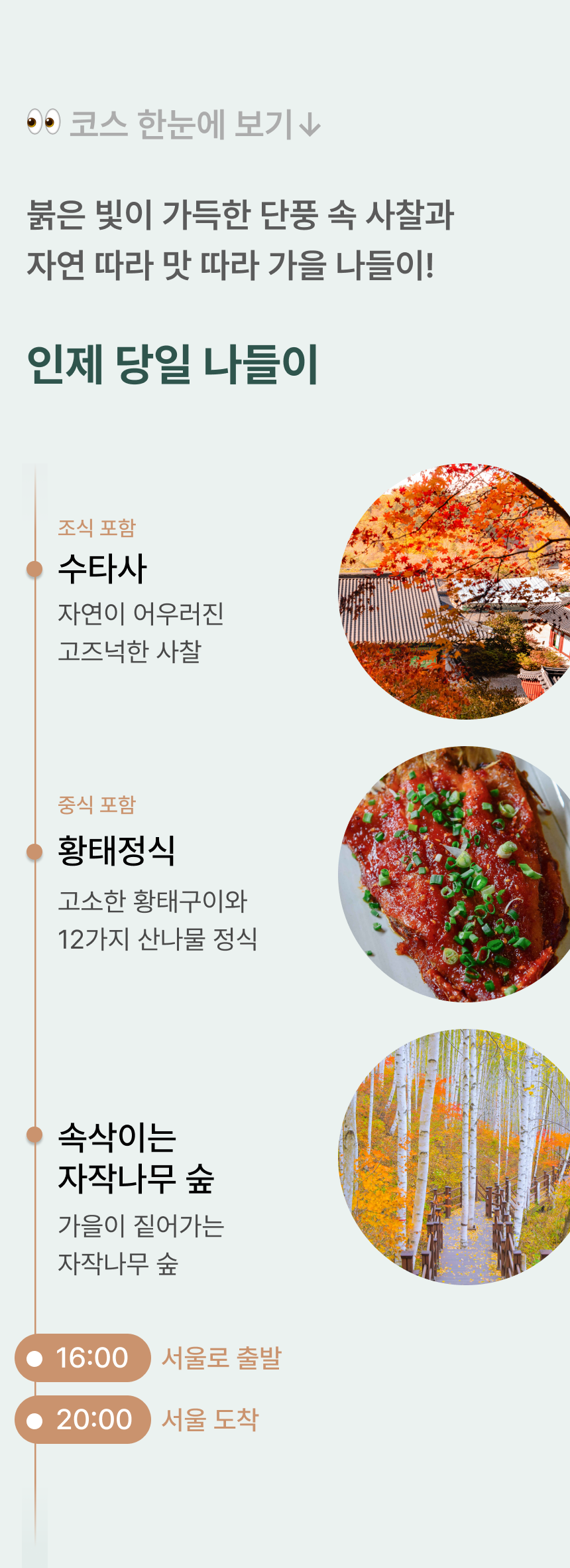 싱그러운 자작나무 숲 산책과 함께 가을빛을 머금은 수타사의 단풍을 즐겨보세요. #자작나무숲 #수타사단풍 #황태정식 • 20인 이상 출발 • 포함 사항 🚌 28인승 리무진 우등버스 1인1좌석 (✽실제 배차 차량은 아너드 그린 차량이 아닐 수도 있습니다.) 💁 여행비서/기사 경비 🥪 조식 샌드위치 🍲 중식 식사 : 황태정식 (✽특정 식재료에 알레르기가 있는 경우, 상세페이지 하단의 원료를 참고해주세요.) • 불포함 사항 📑 여행자 보험, 기타 개인 경비 |
