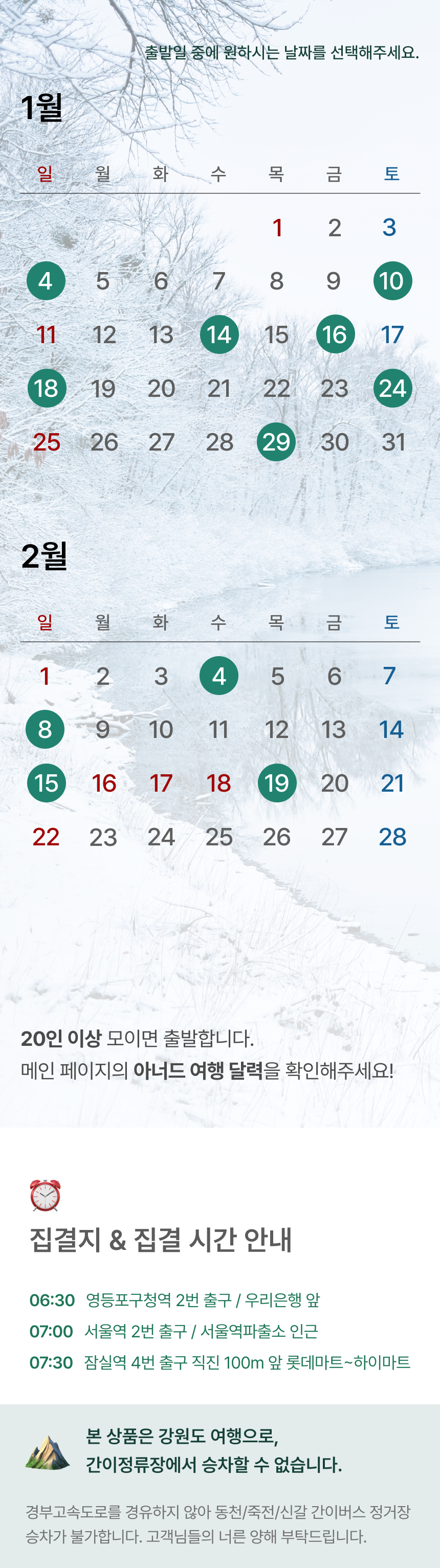 소금산 꼭대기 출렁다리에서, 섬강 옆 자작나무 숲에서 만나는 원주의 겨울 #소금산그랜드밸리 #빙벽카페 #섬강자작나무숲 • 1~2월 출발 한정 2026 아너드 달력 판매 (✽달력 옵션 추가 시 여행 당일 여행비서가 전달드릴 예정입니다.) •20인 이상 출발 • 포함 사항 🚌 28인승 리무진 우등버스 1인1좌석 (✽실제 배차 차량은 아너드 그린 차량이 아닐 수도 있습니다.) 💁 여행비서/기사 경비 🥪 조식 샌드위치 🍱 중식 보리밥정식 🎟️ 소금산 그랜드밸리 입장료(18,000원) • 불포함 사항 📑 여행자 보험, 기타 개인 경비 ☕ 카페 음료 비용 |