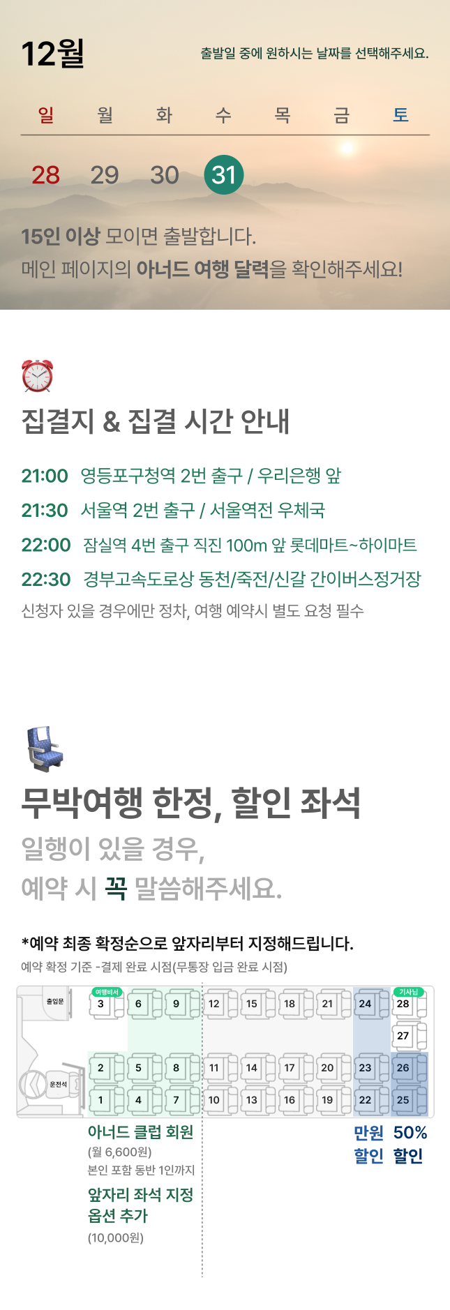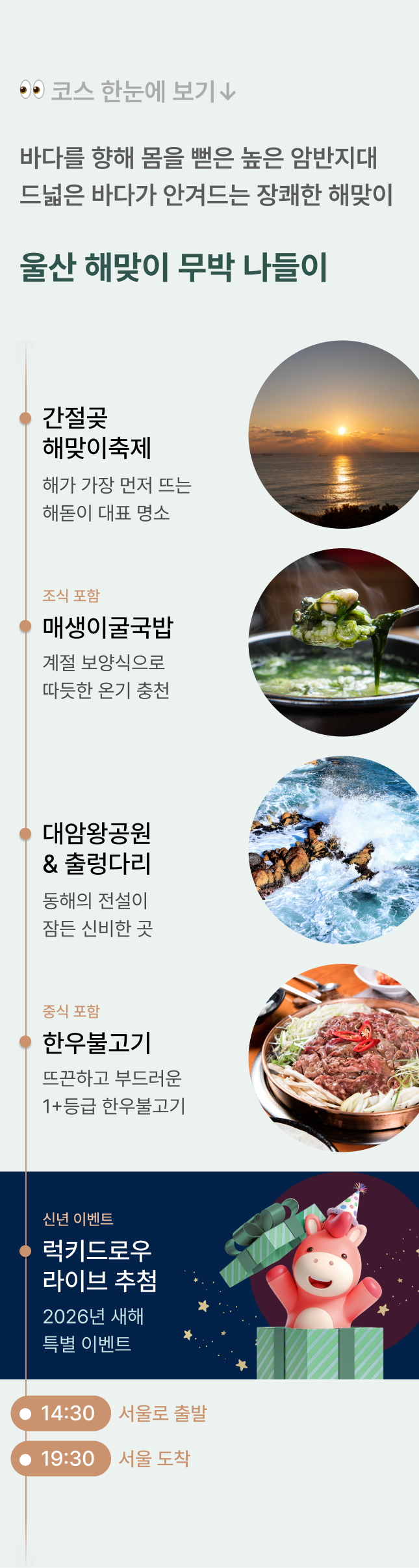 #울산 간절곶 해맞이 #대왕암공원 #출렁다리 #매생이굴국밥 #한우불고기 🎁 해맞이 여행 참여자 전원 럭키드로우 선물 증정 •20인 이상 출발 • 포함 사항 🚌 28인승 리무진 우등버스 1인1좌석 (✽실제 배차 차량은 아너드 그린 차량이 아닐 수도 있습니다.) ✳좌석별 할인안내 확인바랍니다. 🚦기사님 2인 체제 💁 여행비서 🍚 조식 포함: 매생이굴국밥 🍚 중식 포함: 한우불고기 💚 핫팩, 간단 간식, 온열 안대, 일회용 슬리퍼, 칫솔&치약세트 • 불포함 사항 📑 여행자 보험, 기타 개인 경비 |