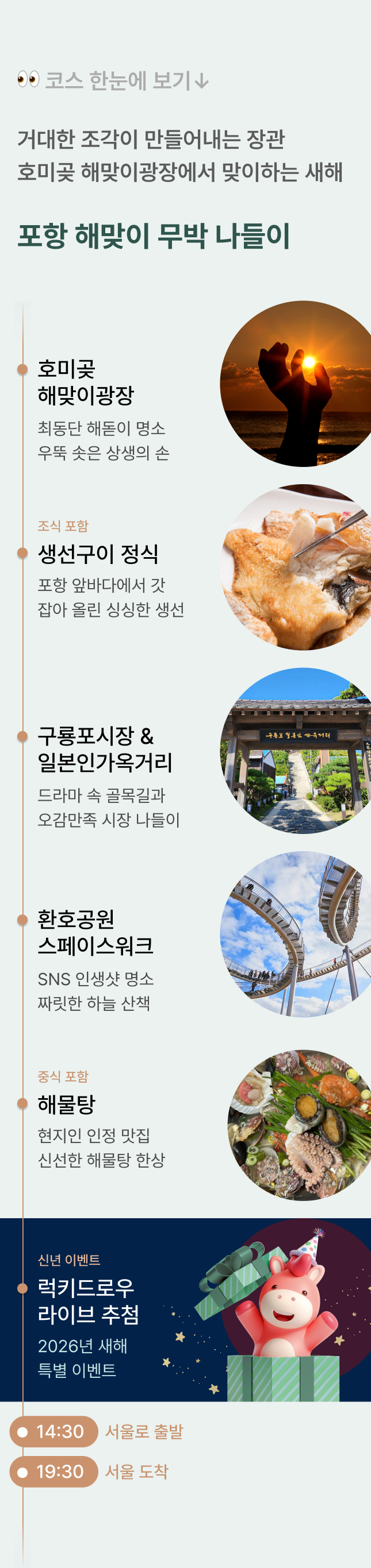 #포항 호미곶 해맞이 #구룡포일본인가옥거리 #구룡포시장 #스페이스워크 #생선구이정식 #해물탕 🎁 해맞이 여행 참여자 전원 럭키드로우 선물 증정 •20인 이상 출발 • 포함 사항 🚌 28인승 리무진 우등버스 1인1좌석 (✽실제 배차 차량은 아너드 그린 차량이 아닐 수도 있습니다.) ✳좌석별 할인안내 확인바랍니다. 🚦기사님 2인 체제 💁 여행비서 🍚 조식 포함: 생선구이정식 🍚 중식 포함: 해물탕 💚 핫팩, 간단 간식, 온열 안대, 일회용 슬리퍼, 칫솔&치약세트 • 불포함 사항 📑 여행자 보험, 기타 개인 경비 |