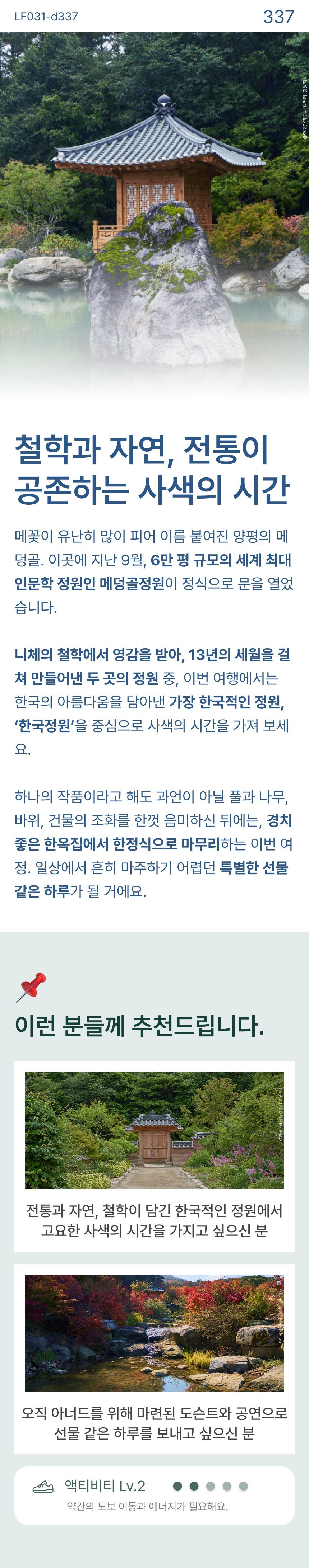 13년 만에 문을 연 세계 최대 인문학정원, 메덩골정원에서의 선물 같은 하루 #메덩골정원 #한국정원 #프라이빗도슨트 #한정식 • 포함 사항 🚌 28인승 리무진 우등버스 1인1좌석 (✽실제 배차 차량은 아너드 그린 차량이 아닐 수도 있습니다.) 🥪 웰컴 중식 샌드위치 💁 여행비서/기사 경비 🍚 석식: 석쇠구이불고기 한정식 🎟️ 메덩골정원 입장료 👨🎨 아너드 고객 대상 프라이빗 도슨트 ☕ 커피(티)&휘낭시에 세트 제공 (✽특정 식재료에 알레르기가 있는 경우, 상세페이지 하단의 원료를 참고해주세요.) • 불포함 사항 📑 여행자 보험, 기타 개인 경비 |