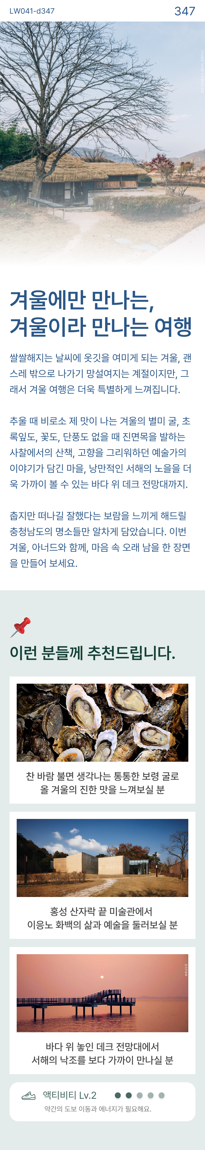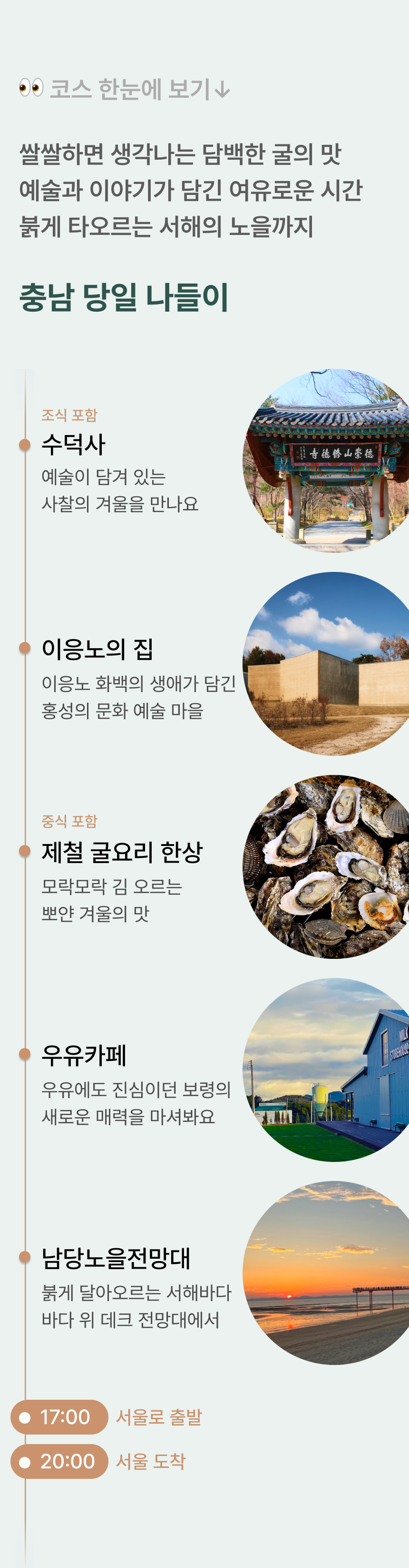 겨울엔 놓칠 수 없는 제철 굴 한 상! 충남에서 알차게 맛보세요. #천북굴단지 #수덕사 #이응노의집 #남당노을전망대 ✻ 이응노의 집 내부공사로 인해, 내부 전시 관람이 불가한 점 너른 양해 부탁드립니다. (12.1(월)~12.22(월)) • 포함 사항 🚌 28인승 리무진 우등버스 1인1좌석 (✽실제 배차 차량은 아너드 그린 차량이 아닐 수도 있습니다.) 💁 여행비서/기사 경비 🥪 조식 샌드위치 🍚 중식 천북굴단지 굴찜 한 상 🎟️ 이응노의 집 입장료 (✽특정 식재료에 알레르기가 있는 경우, 상세페이지 하단의 원료를 참고해주세요.) • 불포함 사항 📑 여행자 보험, 기타 개인 경비 ☕️ 카페 음료 비용 |