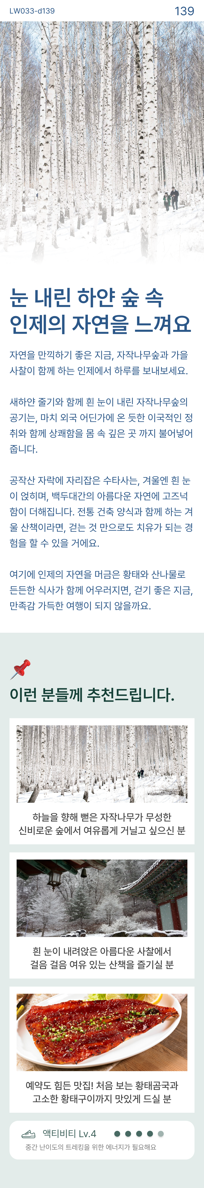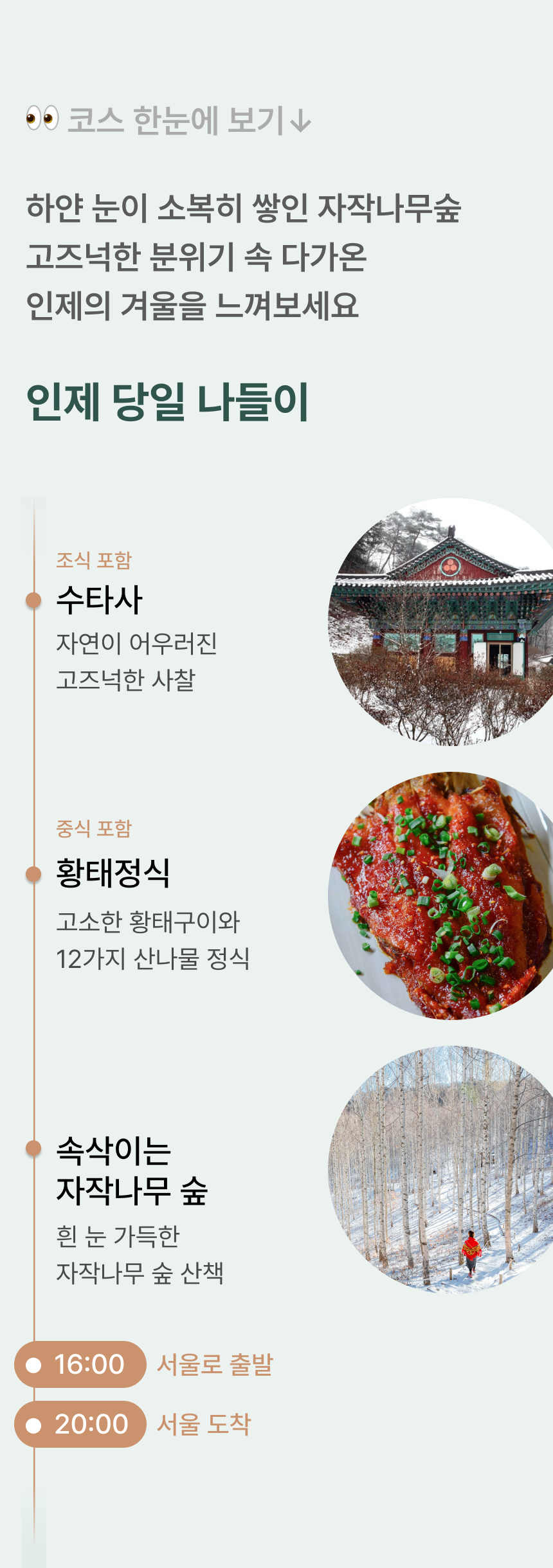 눈 내린 새하얀 자작나무숲에서, 이국적인 정취 가득한 산책 #자작나무숲설경 #수타사 #황태정식 • 20인 이상 출발 • 포함 사항 🚌 28인승 리무진 우등버스 1인1좌석 (✽실제 배차 차량은 아너드 그린 차량이 아닐 수도 있습니다.) 💁 여행비서/기사 경비 🥪 조식 샌드위치 🍲 중식 식사 : 황태정식 (✽특정 식재료에 알레르기가 있는 경우, 상세페이지 하단의 원료를 참고해주세요.) • 불포함 사항 📑 여행자 보험, 기타 개인 경비 |
