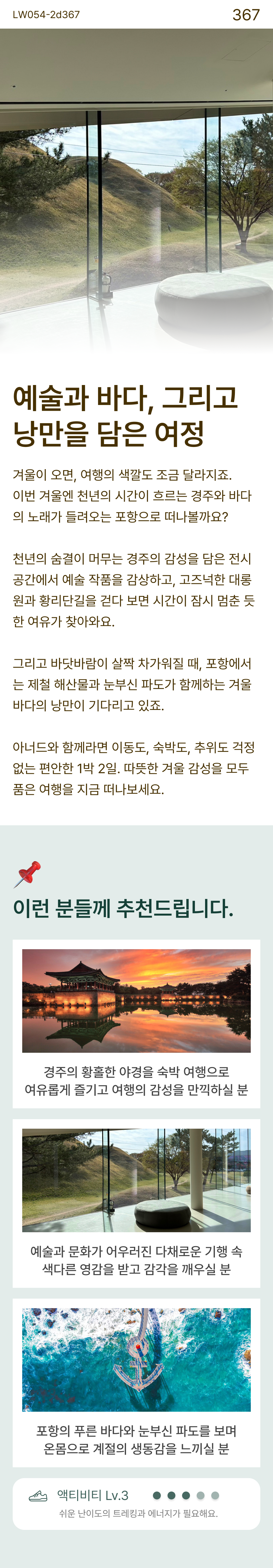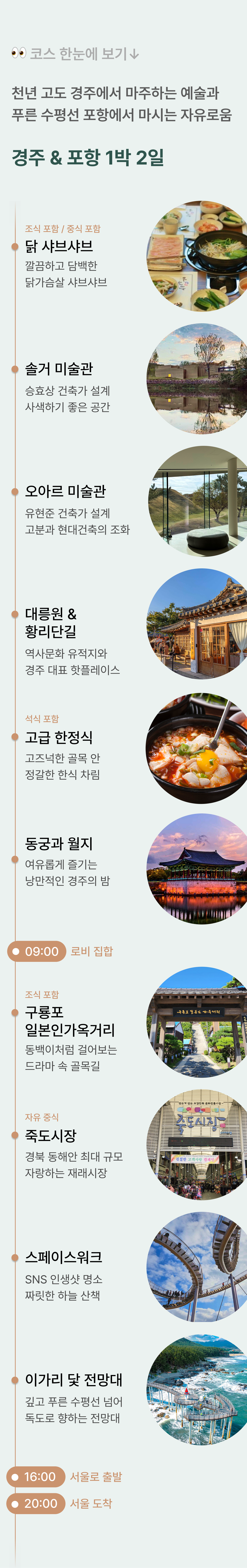 천년 고도 경주에서 마주하는 예술, 푸른 수평선 포항에서 마시는 자유로움을 느껴요. #오아르미술관 #솔거미술관 #동궁과월지 #황리단길 #죽도시장 #구룡포가옥거리 #스페이스워크 #이가리닻전망대 ✽ 주말 여행 시 혼잡을 고려하여, 2일차 일부 일정에 30분을 추가 편성하였음을 안내드립니다. ✽ 금액 안내