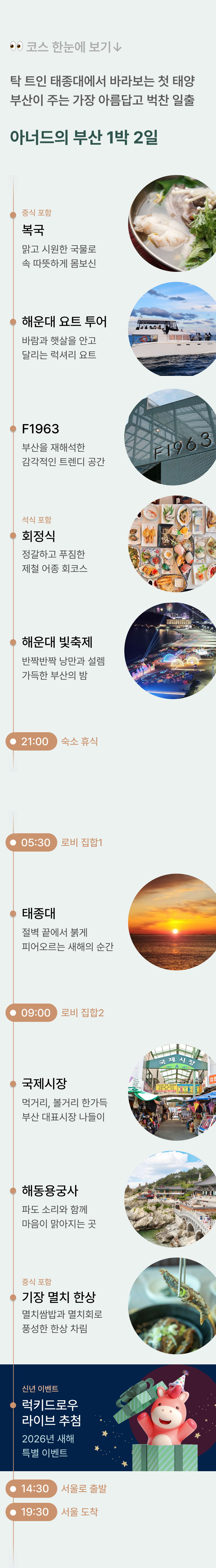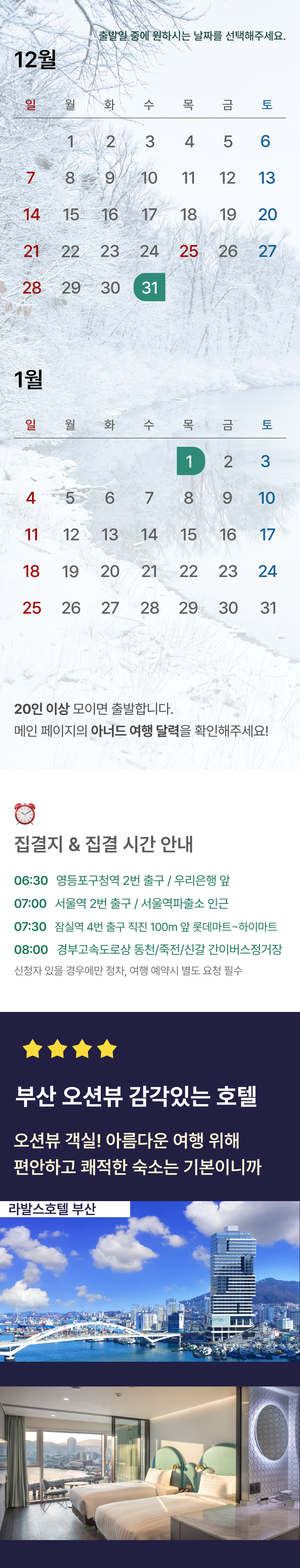 #태종대일출 #해운대빛축제 #요트투어 #해동용궁사 #F1963 #국제시장 #회코스 #은복국 #기장멸치한상 🎁 해맞이 여행 참여자 전원 럭키드로우 선물 증정• 최소 20인 출발 • 포함 사항 🚌 리무진 우등버스 1인1좌석 🏨 4성급 고급 호텔 (객실 타입은 선착순 배정됩니다) ⁕ 숙박 요금은 평일과 주말, 숙박 인원에 따라 달라집니다. ✽ 금액 안내