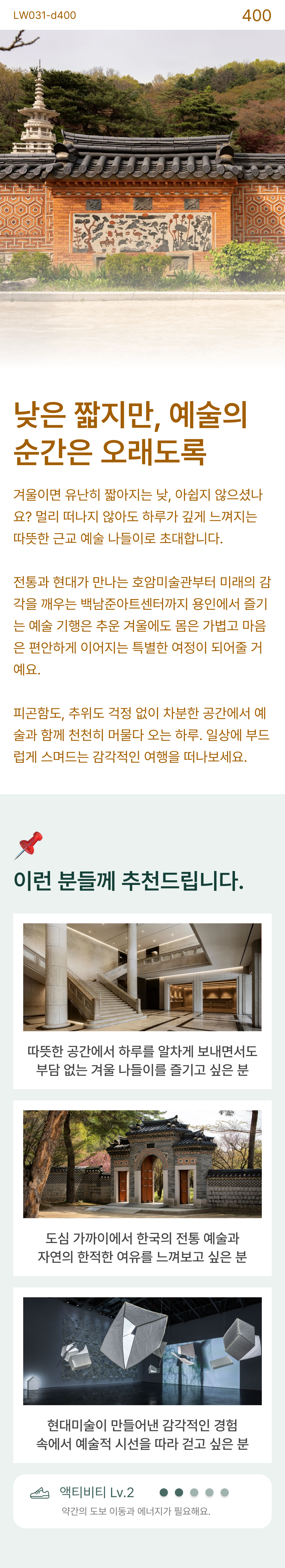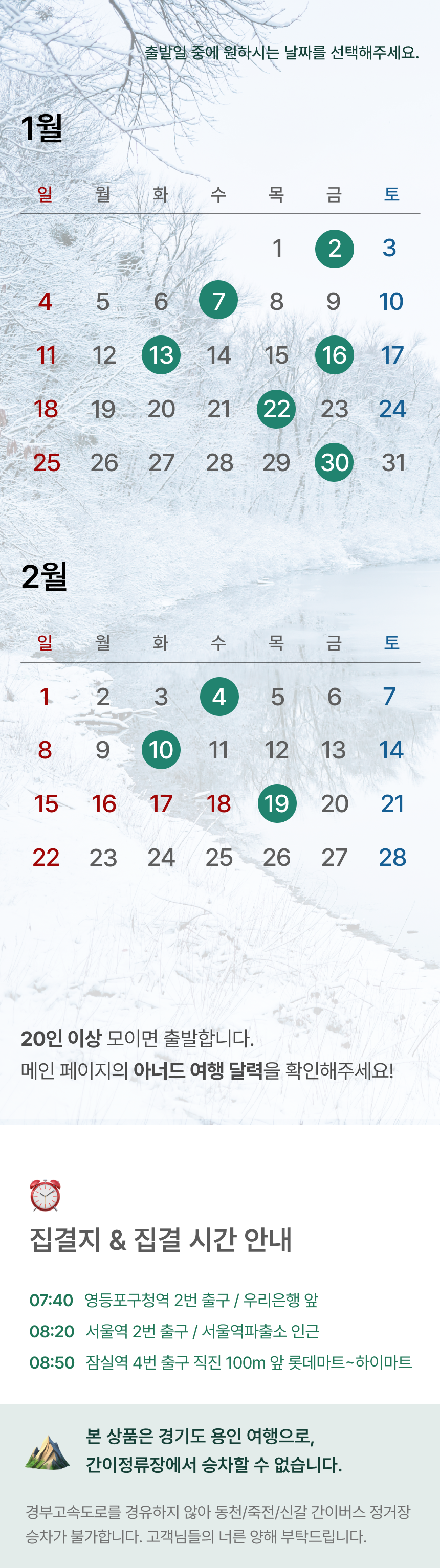 겨울빛은 짧아져도, 용인에서 예술의 순간은 길게 #호암미술관 #백남준아트센터 #도슨트투어 #녹각삼계탕 • 1~2월 출발 한정 2026 아너드 달력 판매 (✽달력 옵션 추가 시 여행 당일 여행비서가 전달드릴 예정입니다.) • 20인 이상 출발 • 포함 사항 🚌 28인승 리무진 우등버스 1인1좌석 (✽ 실제 배차 차량은 아너드 그린 차량이 아닐 수도 있습니다.) 💁 여행비서/기사 경비 🥪 조식 샌드위치 🍚 중식 녹각삼계탕 🎟️ 호암미술관 입장료 (✽특정 식재료에 알레르기가 있는 경우, 상세페이지 하단의 원료를 참고해주세요.) • 불포함 사항 📑 여행자 보험, 기타 개인 경비 |